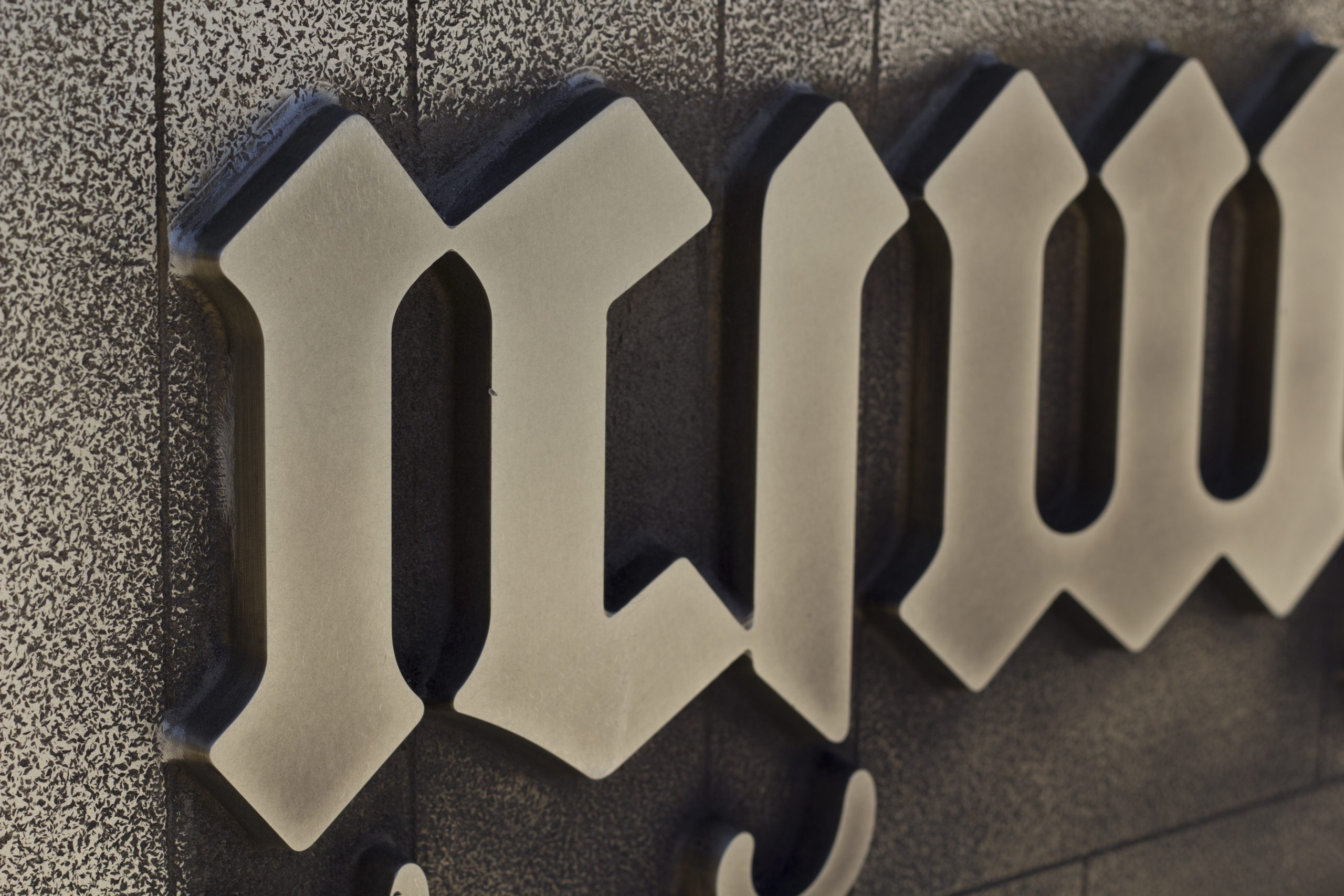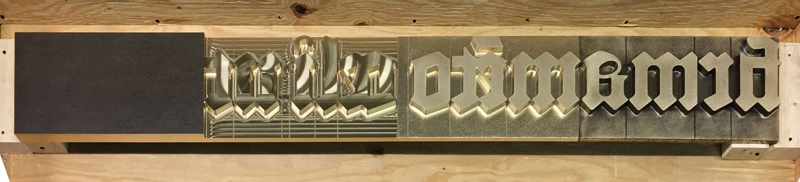 DETAIL: SINGLE LINE OF MILLED TEXT ON BRONZE PLATE.