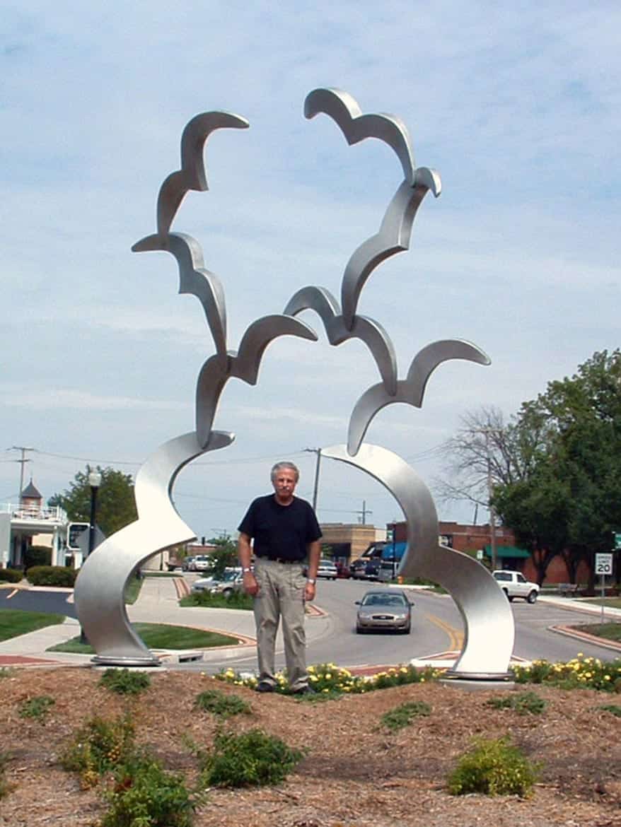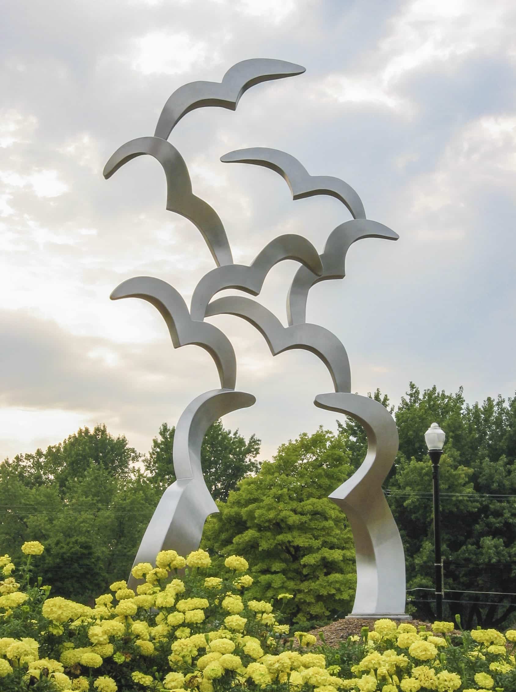 A Great Place to Land is an artwork by Gary Kahle located in Overland Park which was made using Zahner art fabrication services. Completed in 2006, the sculpture projects into the sky at the intersection of Conser and Santa Fe Drive. The permanent outdoor public artwork depicts two birds flying upwards in unison, and the work was provided by the Arts and Recreation Foundation of Overland Park in Overland Park, Kansas.