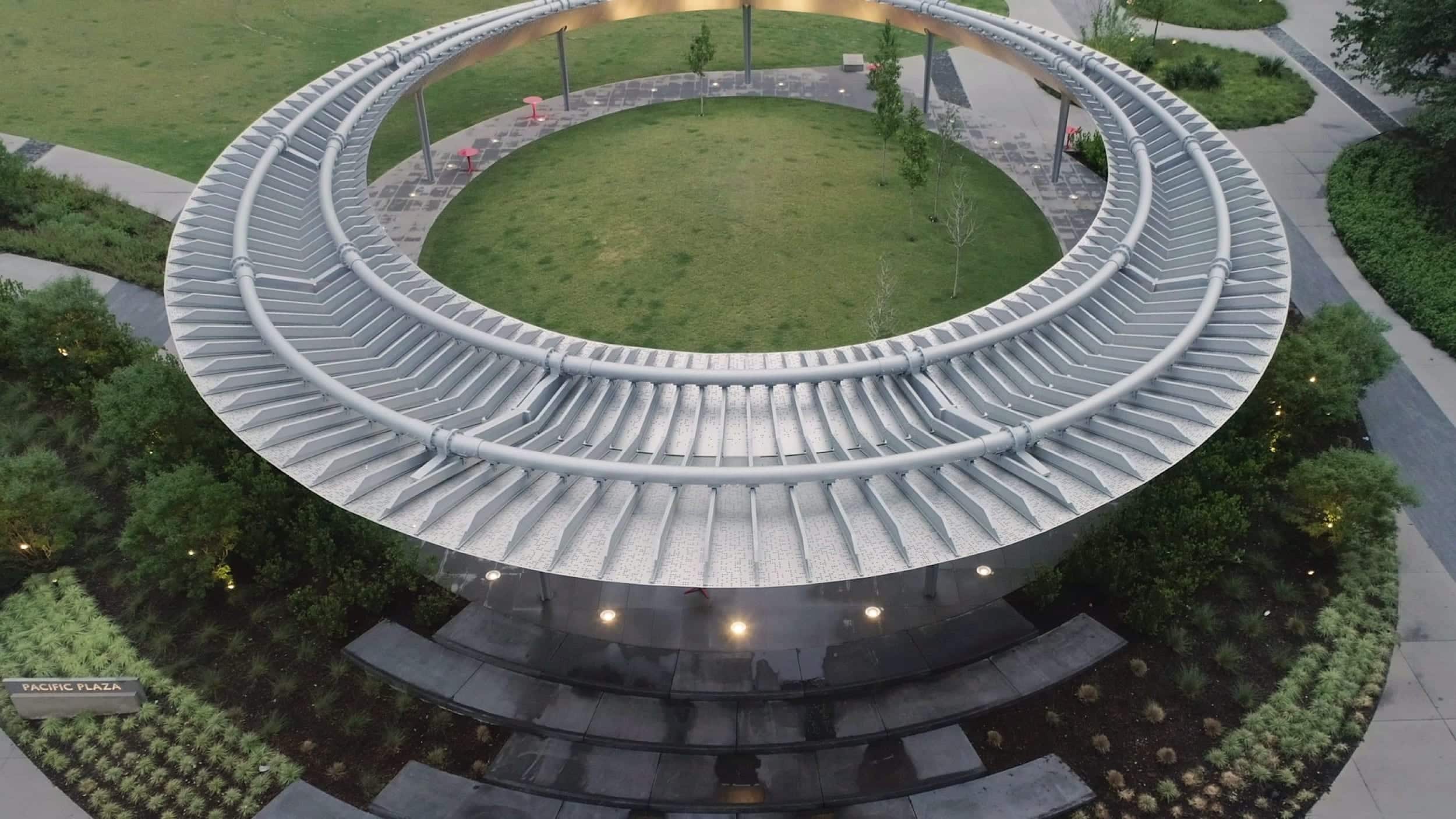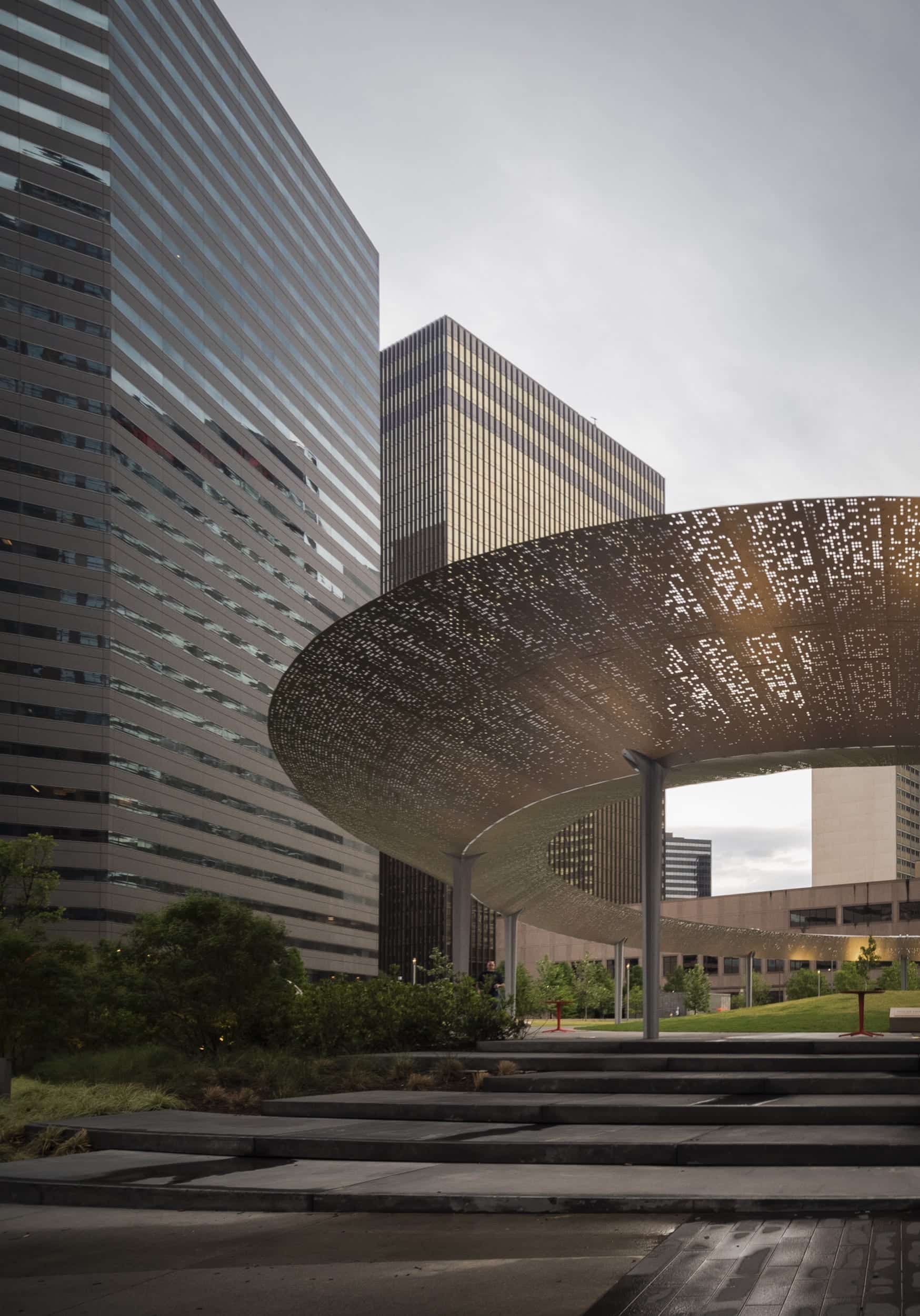 Zahner was brought on board to provide Zahner Assist services, budgeting and ultimately engineering and fabrication of 323 unique perforated panels that make up the elliptical pavilion. For those conversant with Morse code, the perforated panels can tell a story. In addition to reducing the urban island heat, it also provides dappled light for casual visitors.
