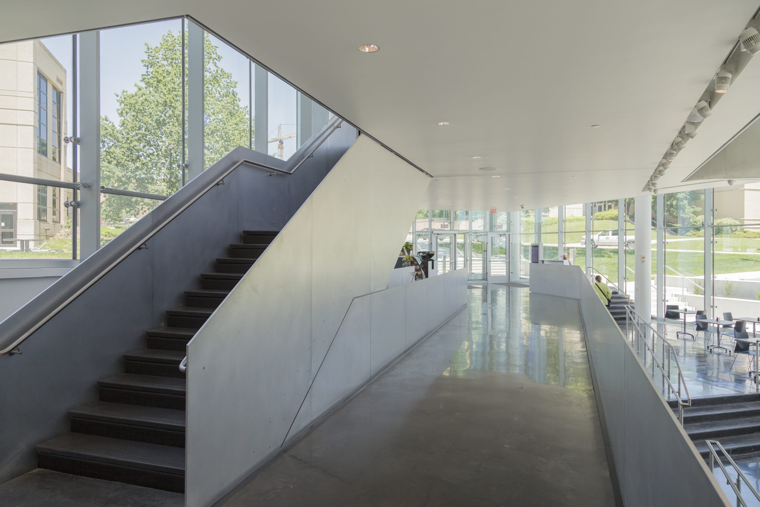 Zahner also completed a series of interior guardrails from 5/8” aluminum, in an Angel Hair finish to match the surrounding walls. These were made from solid plates connected only at the floor level, stairs, and ramp.