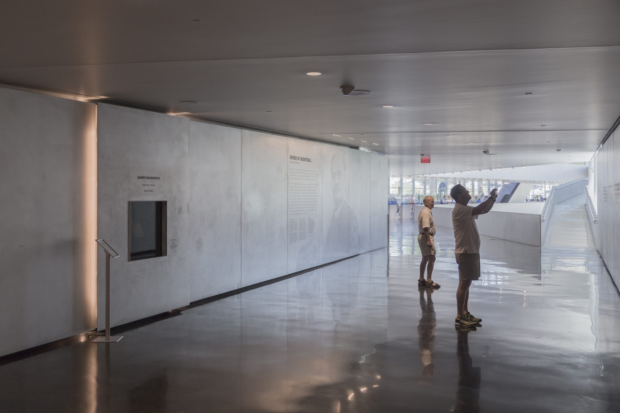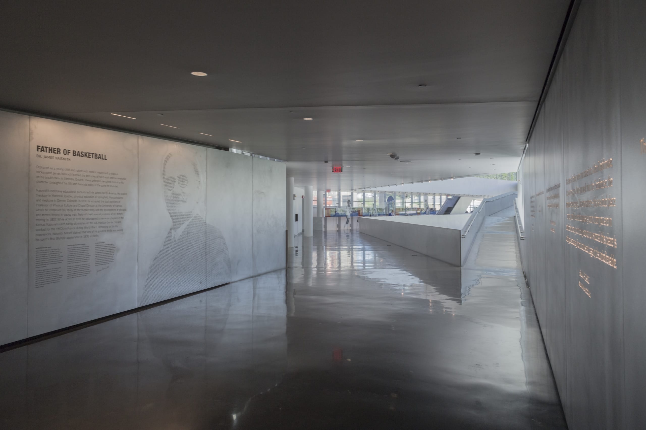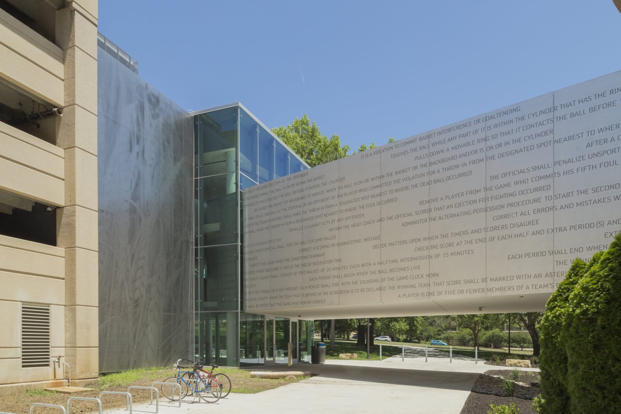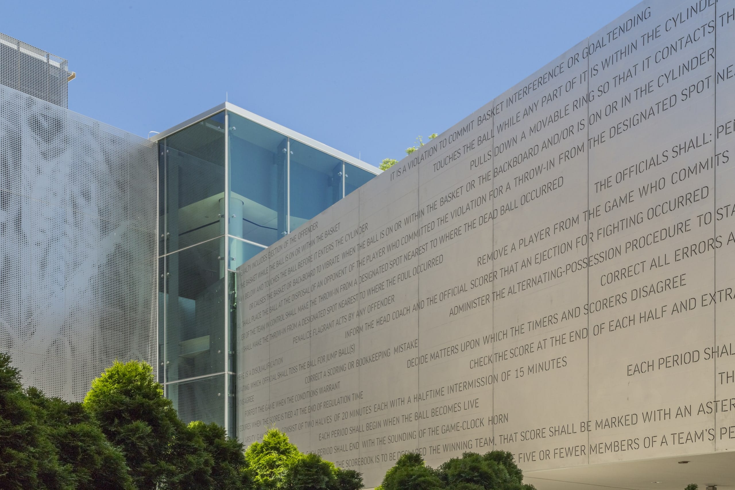 The Zahner team was tasked with creating large cut-out aluminum panels bearing the original rules for the game of basketball. The interior panels also contain a direct screenprint of text on aluminum, which maps out the visage of Naismith and Phog Allen.