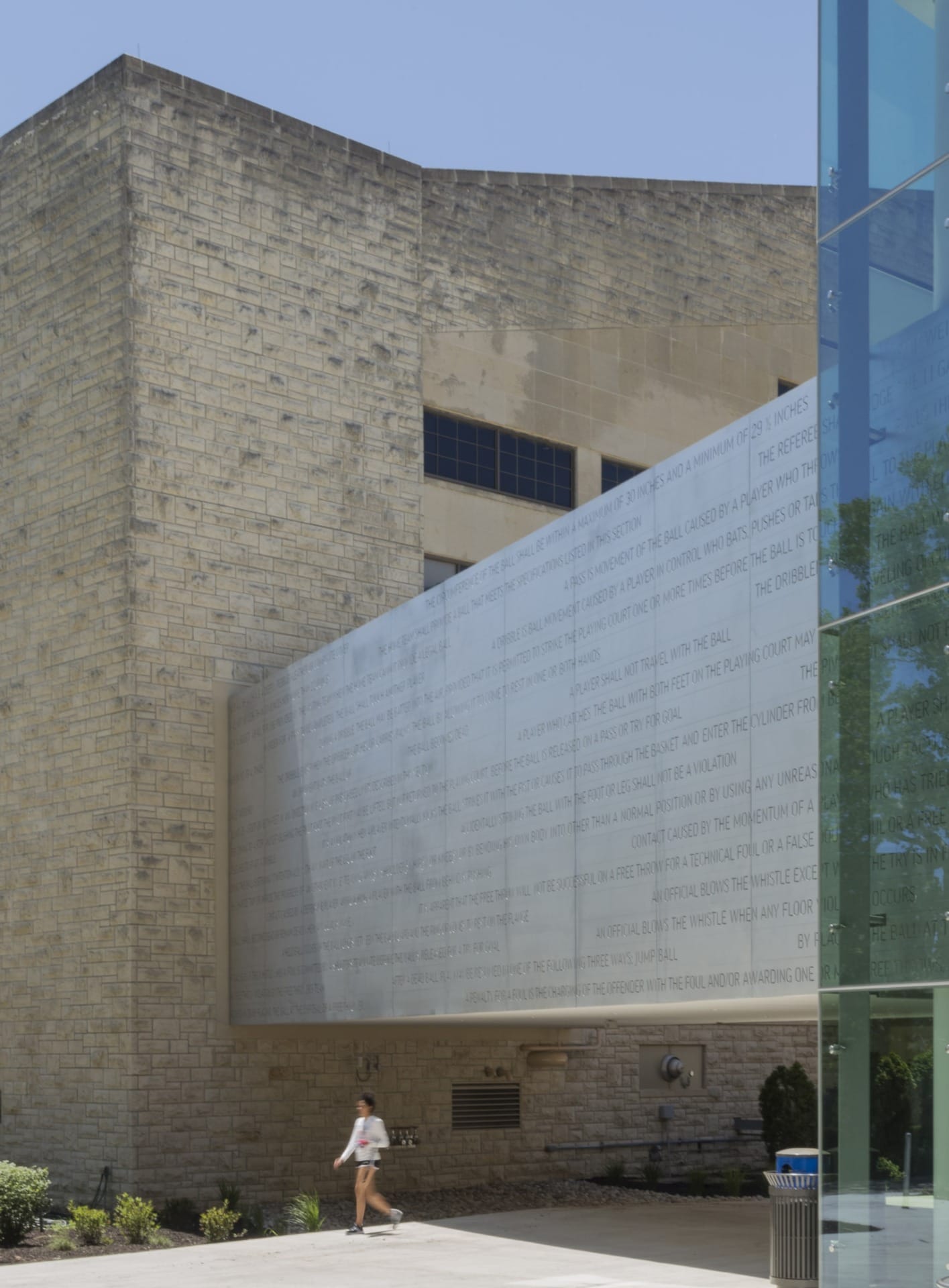 The adjacent west wall contains direct screenprinted text on aluminum. This text utilizes a similar visual trope to ZIRA in that it uses letterforms to map out the image of Naismith and Phog Allen, drawing yet another visual parallel between these founding fathers and the legacy of basketball at KU.