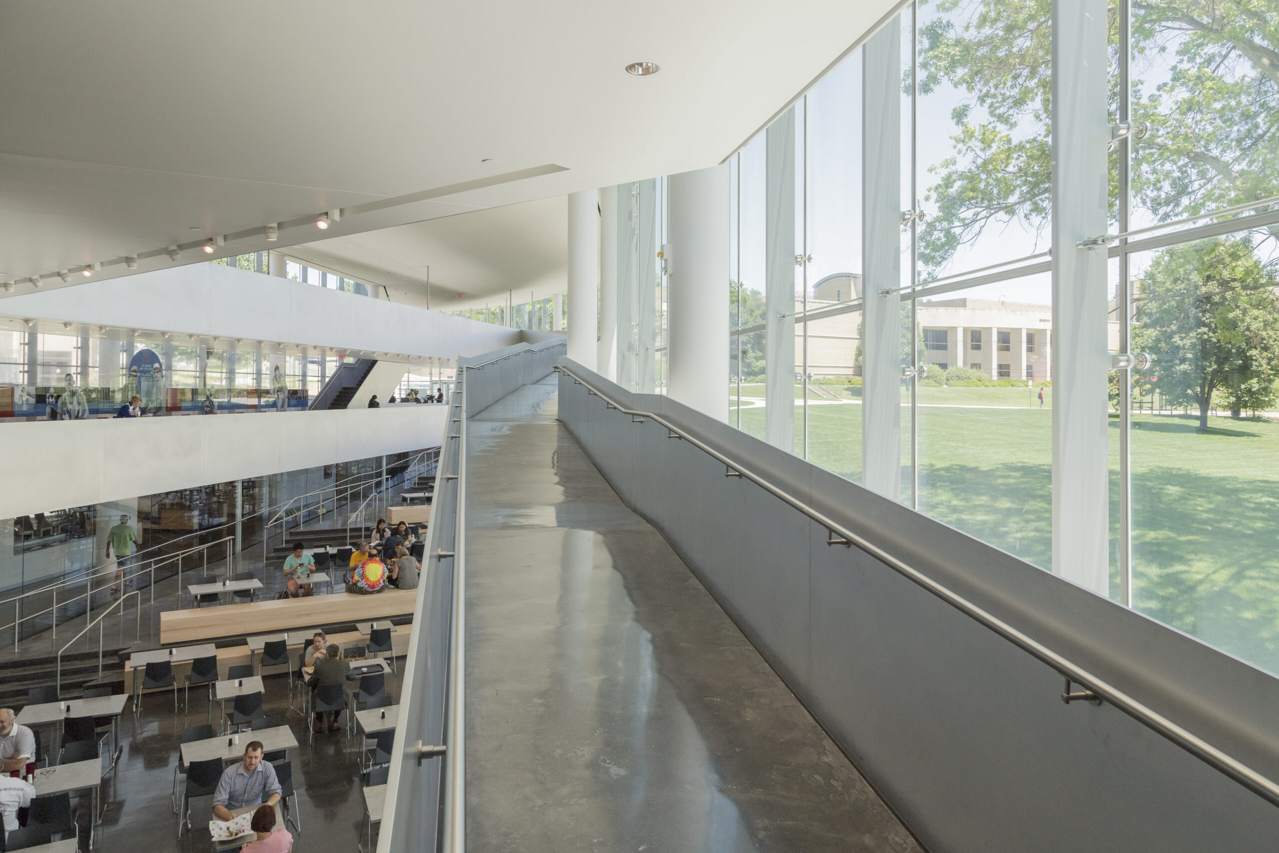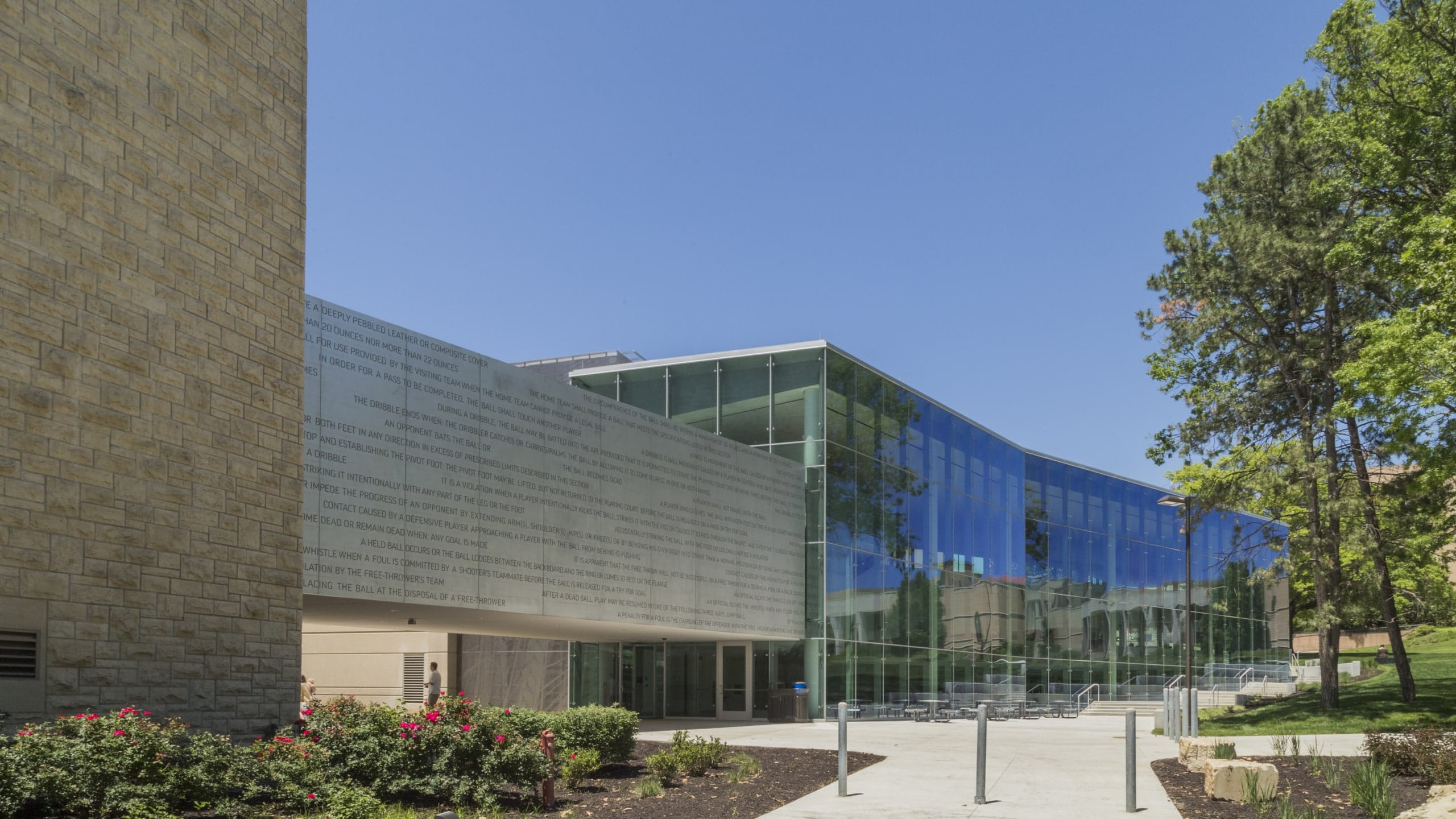 The existing Allen Fieldhouse building at KU is now connected by a bridge to the Debruce Center. This connects the new exhibit and visitor center to historical Allen Fieldhouse, where the KU basketball team regularly plays their local games. This connection helps to physically explain the history of KU’s sports program. James Naismith (the ‘father’ of basketball) and Forrest “Phog” Allen (the ‘father’ of basketball coaching) each had an integral role in building this legacy. By physically connecting the two spaces, the designers at Gould Evans have built a literal link between the past and future of basketball at KU.