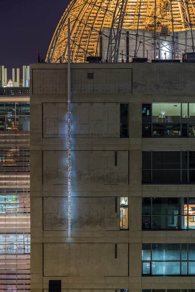 The Mast is constructed in aluminum with varying perforations which run up around its length. Inside of the mast is an interior LED lighting system, which provides a beacon of star-studded lights which illuminates the facade throughout the evening hours. The mast was manufactured by Zahner in Kansas City, and installed by a local team in San Diego.
