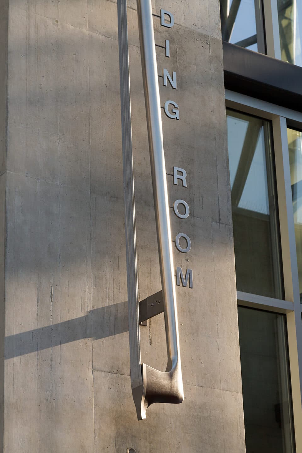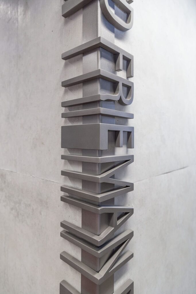 One of the themes that moves throughout the entirety of the library is a bar code motif, extruding from the letter forms of various donor plaques and signage elements on both the interior and exterior surfaces of the library. The extruded letter forms also break planes and wrap around columns, walls, and concrete boundaries.