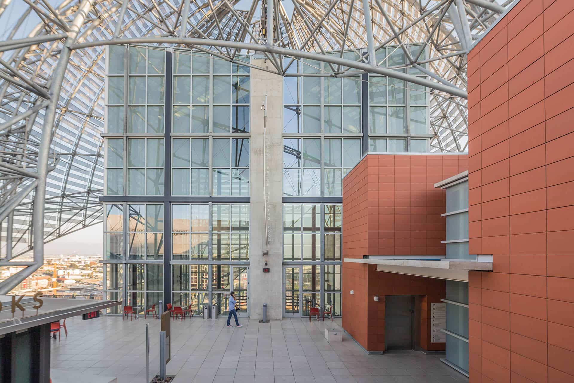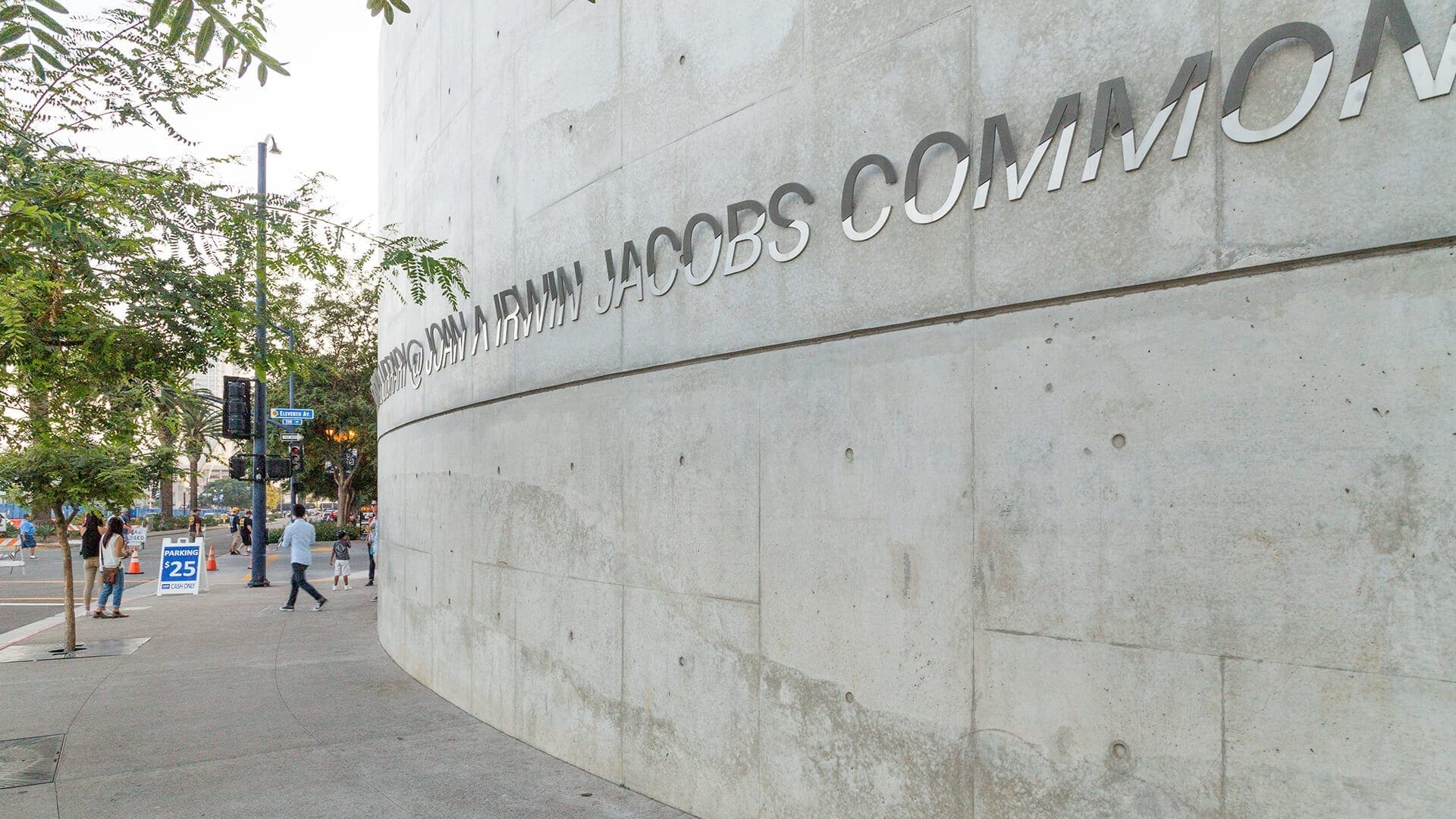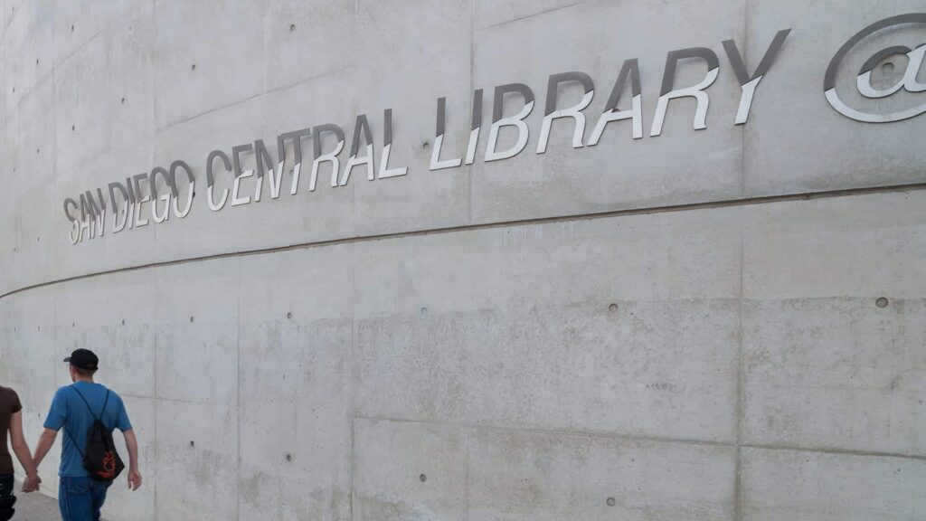 At the building’s South entrance are multiple signage elements for the San Diego Library Joan & Irwin Jacobs Common, recognizing the philanthropist team who donated $20 million towards the library’s operational costs.