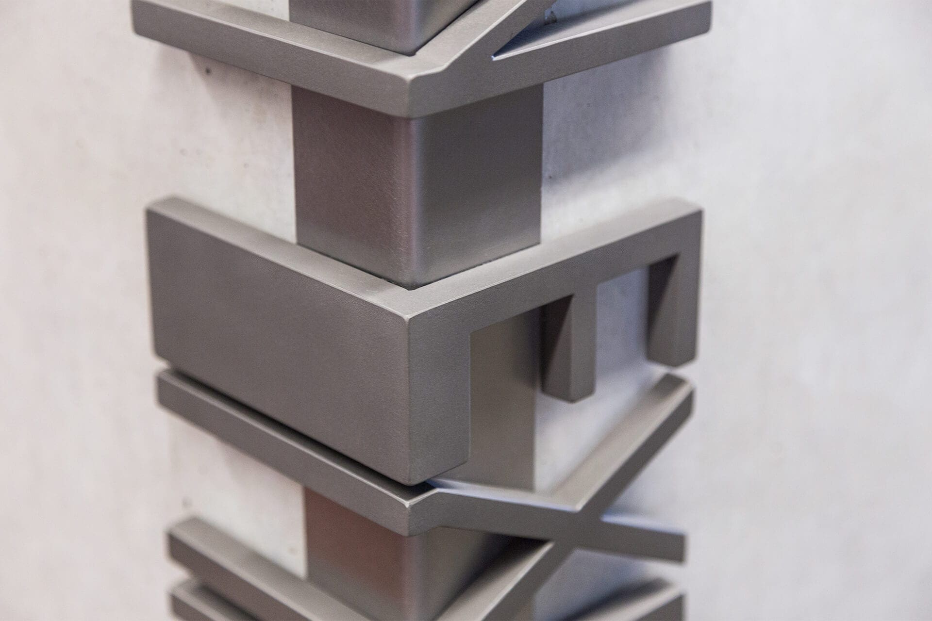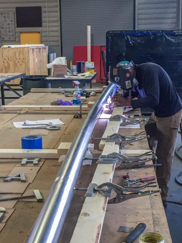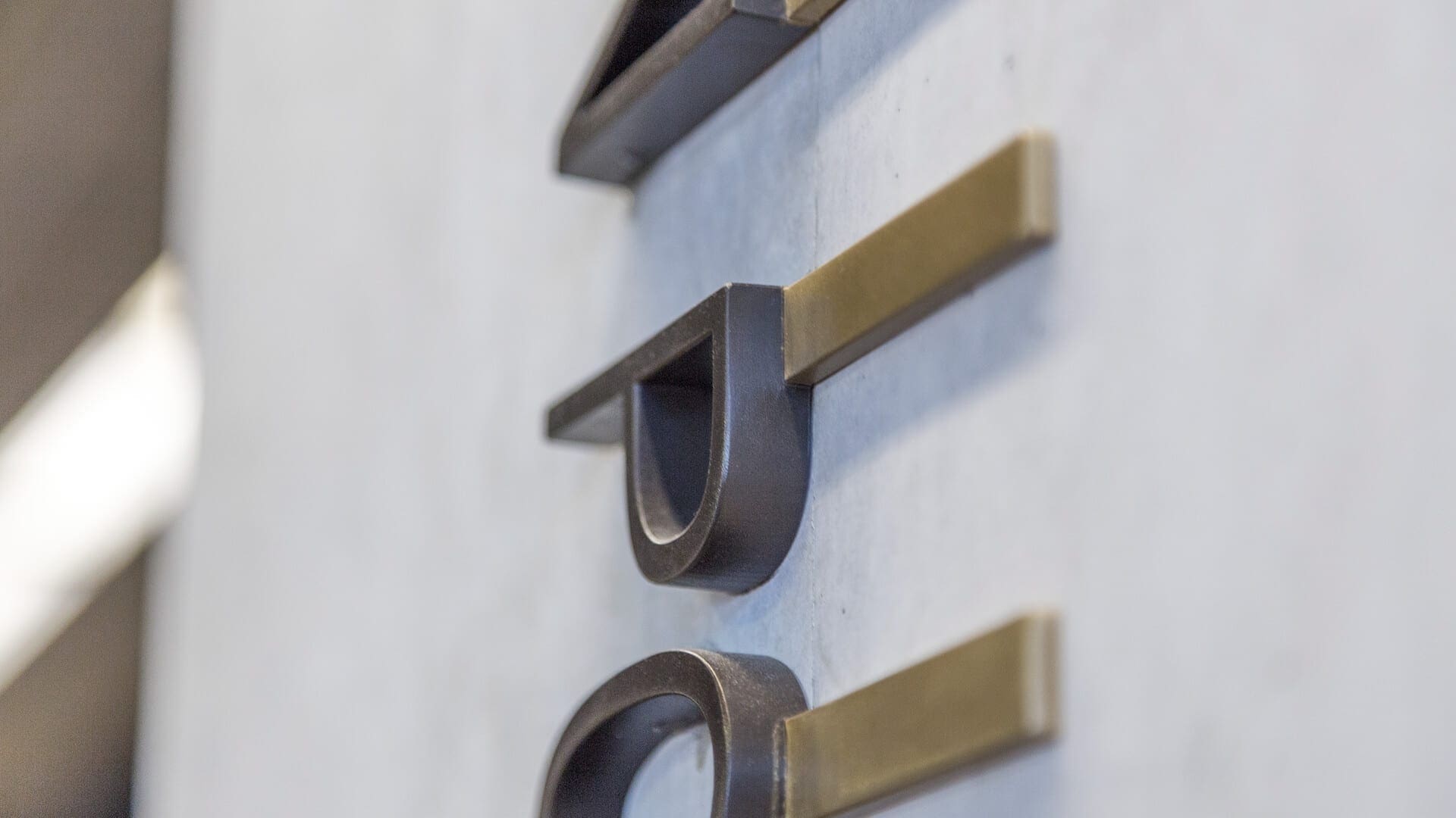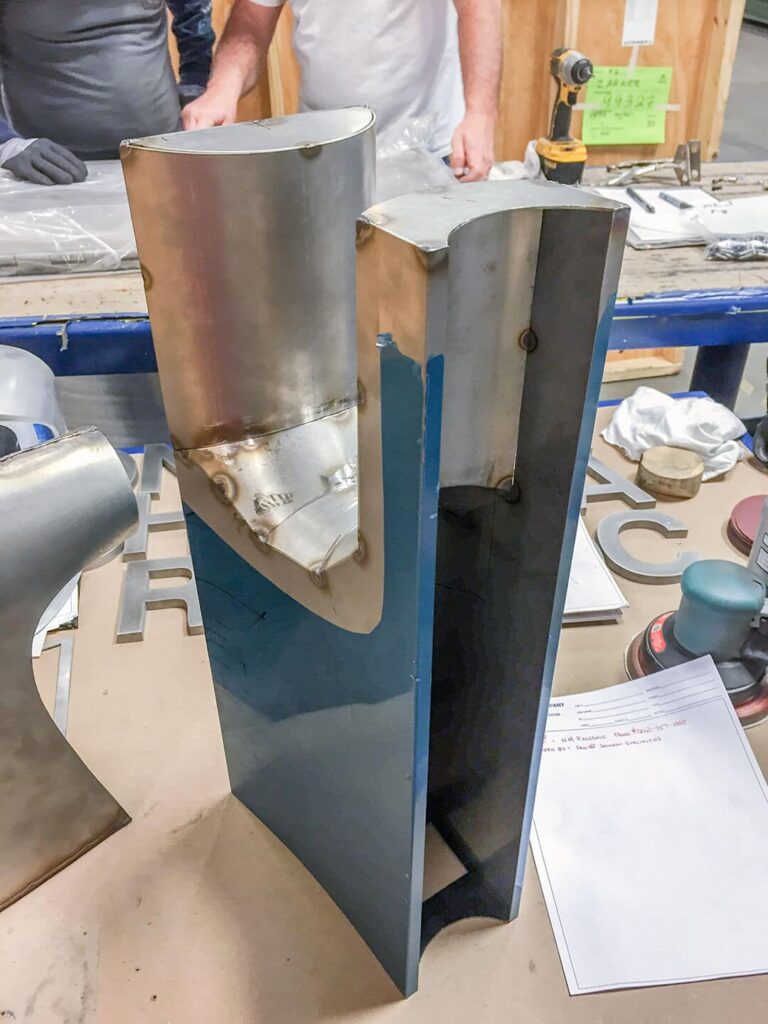 The thick metals used in the custom signage include stainless steel and bronze, and included areas that are painted, as well as areas that let the metal surface shine through, much of which uses Zahner’s Angel Hair mechanical non-directional surface treatment.