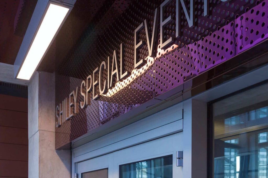 One of the final donors donors for the new library, Darlene Shiley placed $1.2 million towards the library’s operational fund, and her donation is honored with a rooftop events suite. The entrance to the space is clad in interference stainless steel, perforated using a custom pattern. The Zahner system used to lay out the decorative metal screen panels is based on the ImageWall/ZIRA system, which also provides for a muted seam where the perforations continue across the joint’s reveal.