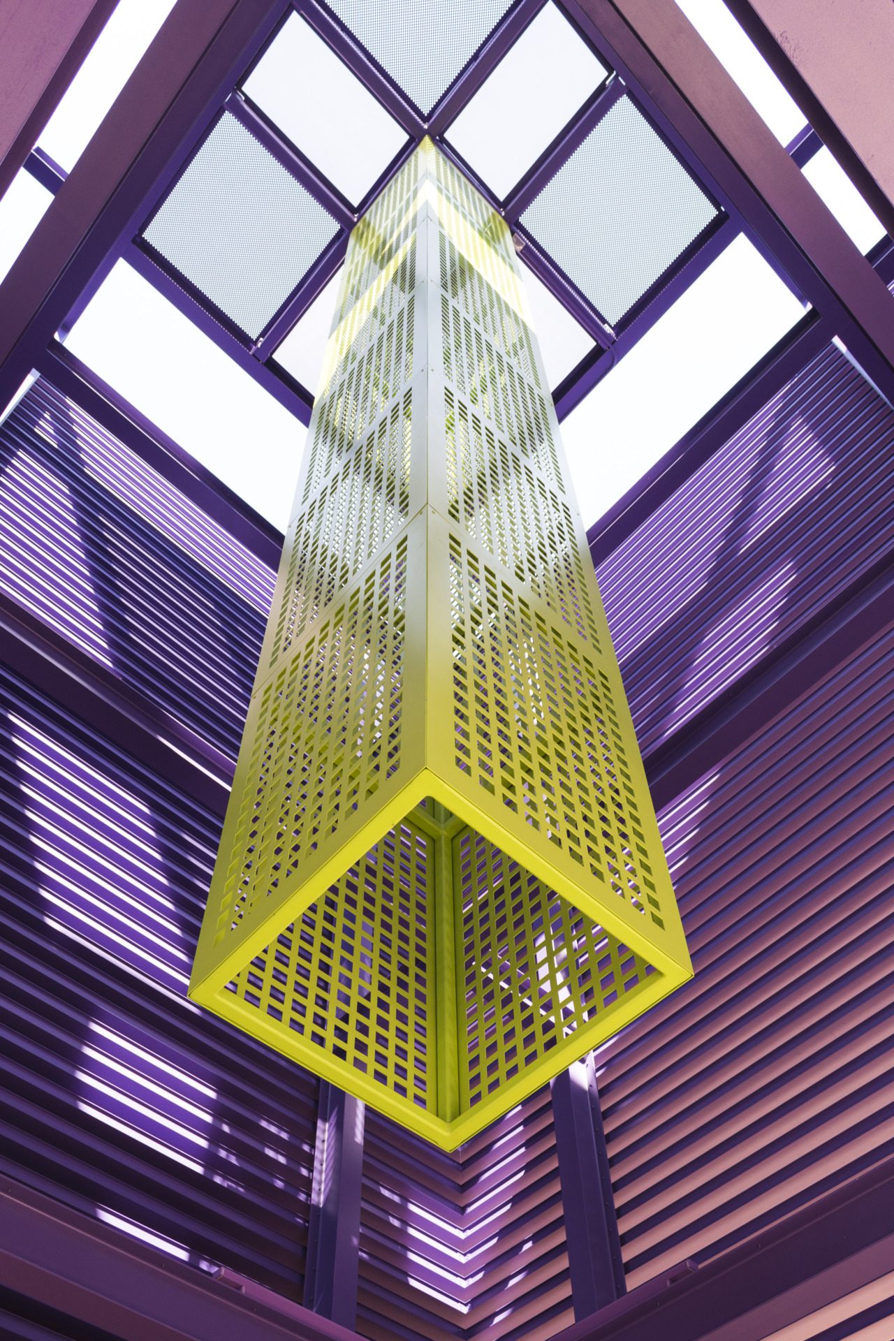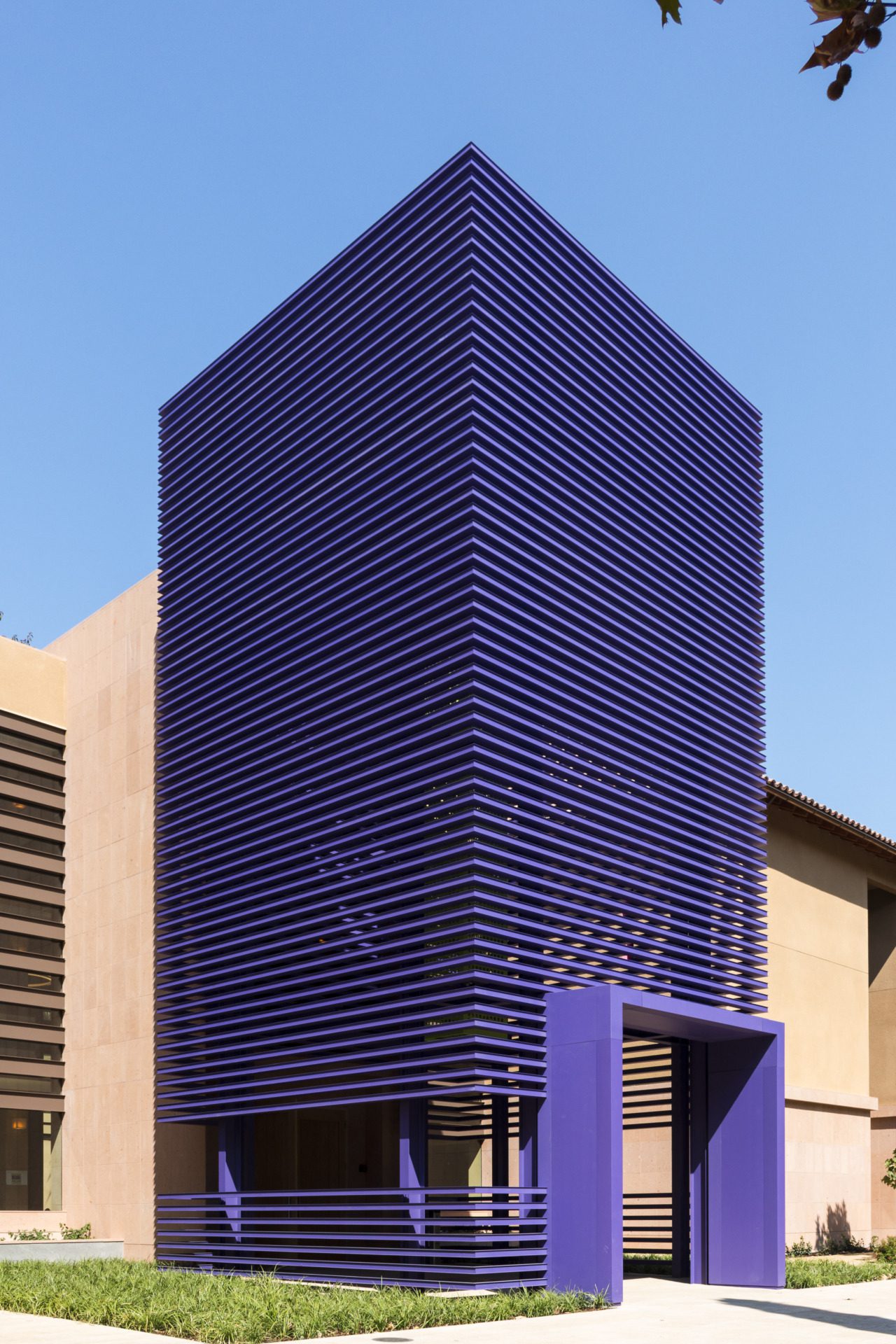 Zahner also created a striking custom entryway from a custom aluminum extrusion. This element was finished in a purple powder-coated paint. All elements were engineered, fabricated, and installed by Zahner, ensuring durability and artistic integrity.