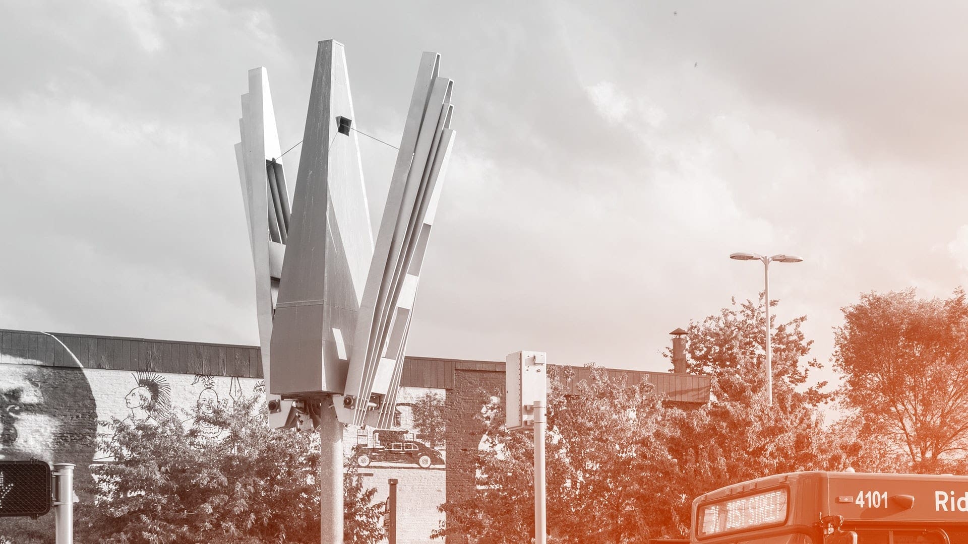 Detail of the kinetic sculpture Seven Sentinels, a public artwork by Matthew Dehaemers.