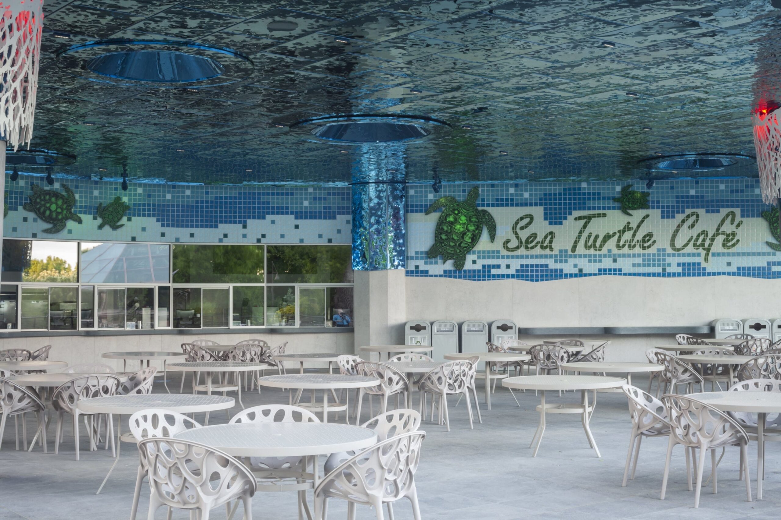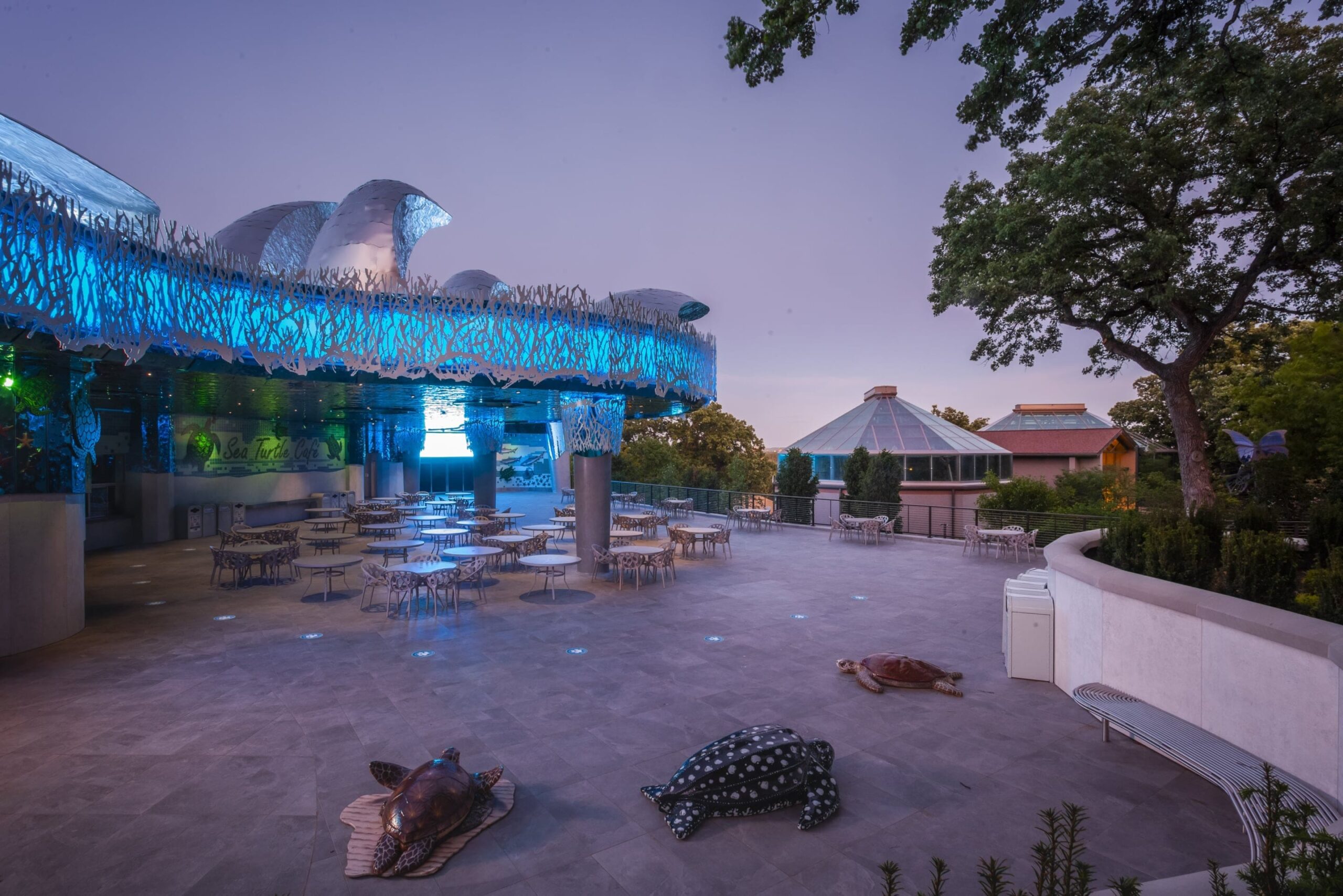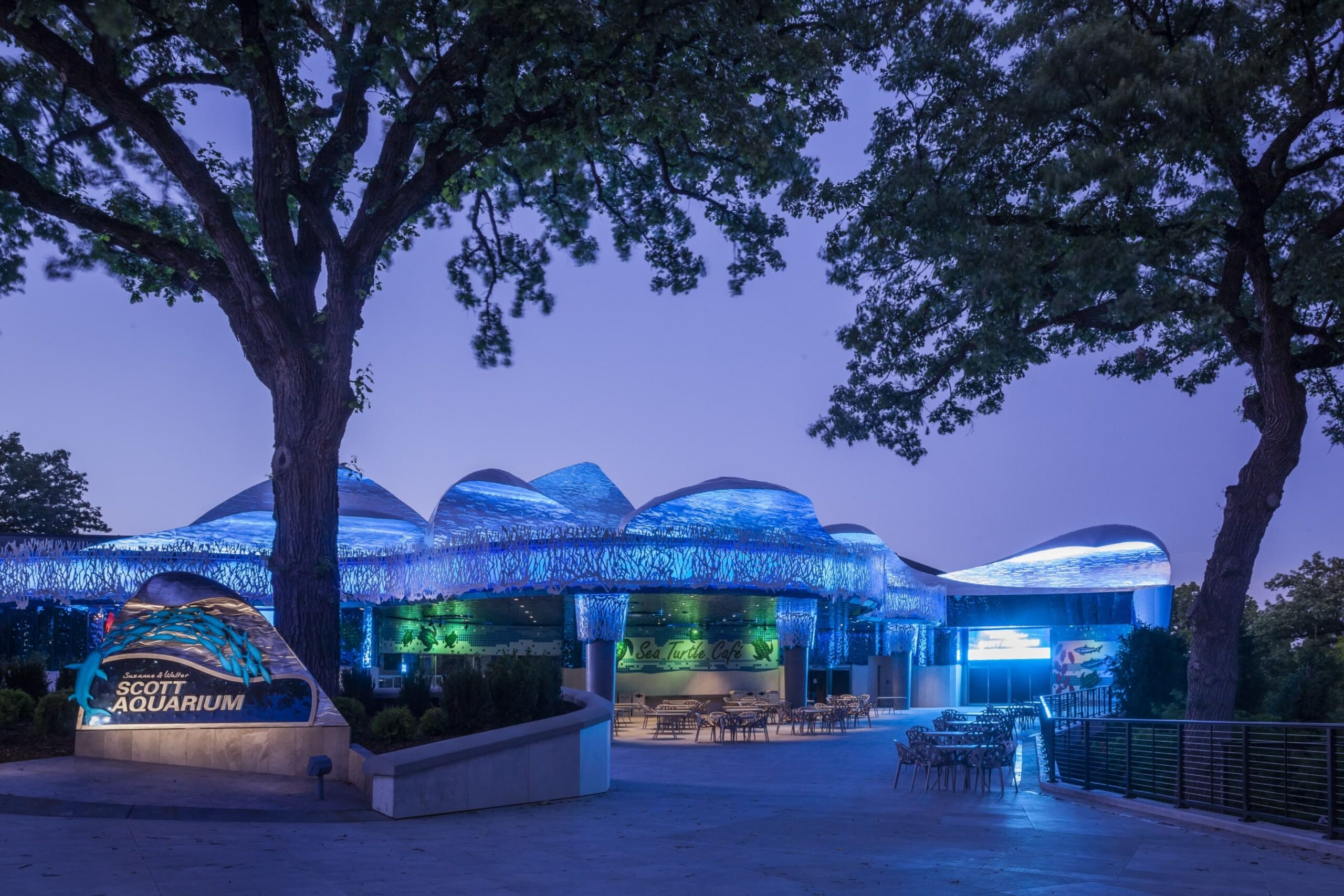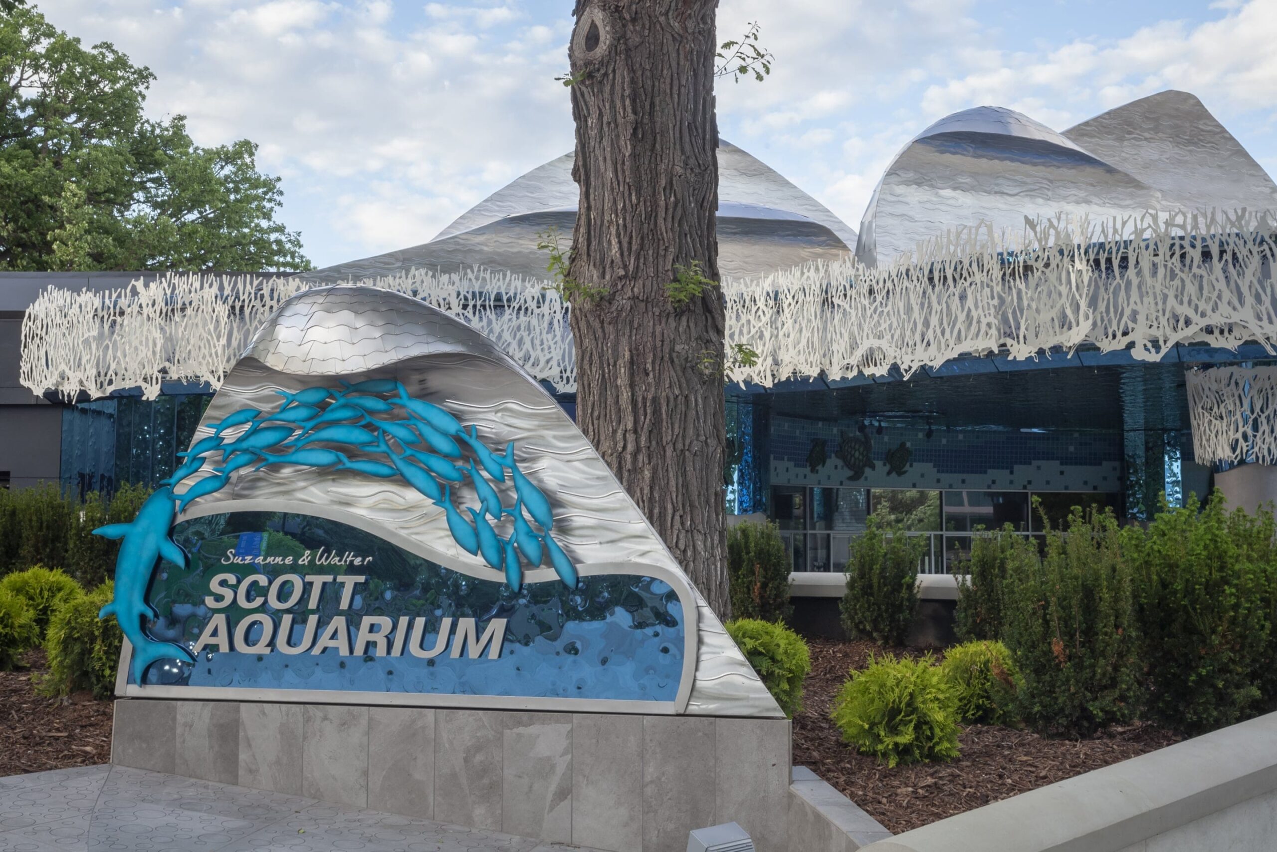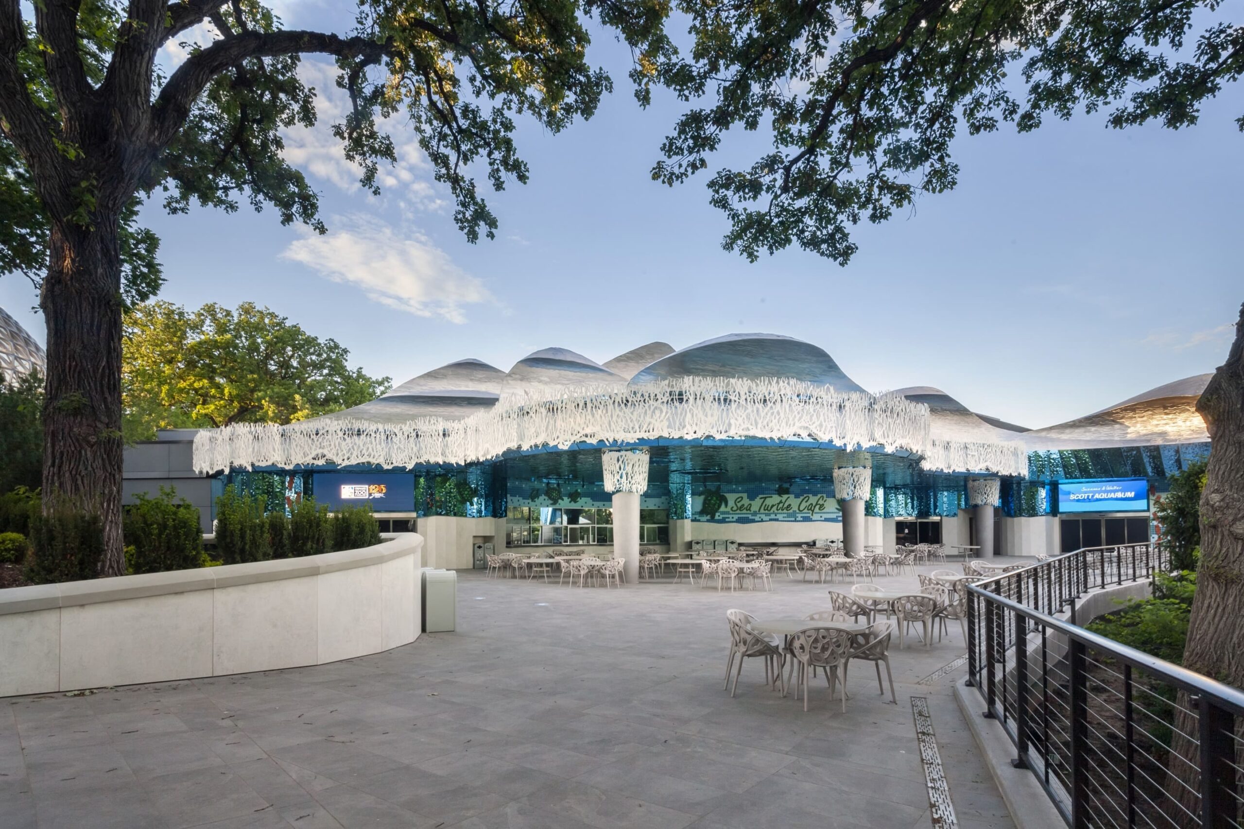 Originally built in 1995, renovations for the Suzanne and Walter Scott Aquarium at the Omaha Zoo were completed in May 2020, featuring a redesigned facade, an updated outdoor cafeteria area, and new entrance features to the aquarium and aquarium conference center. As our third project in the Omaha metro area, Zahner provided various new design elements for this renovation, including the stainless steel wave facade on top of the building, the custom-cut metal coral features and column covers, the dimpled blue stainless steel cladding around the café, and the milled sea creatures that adorn the walls surrounding the space.