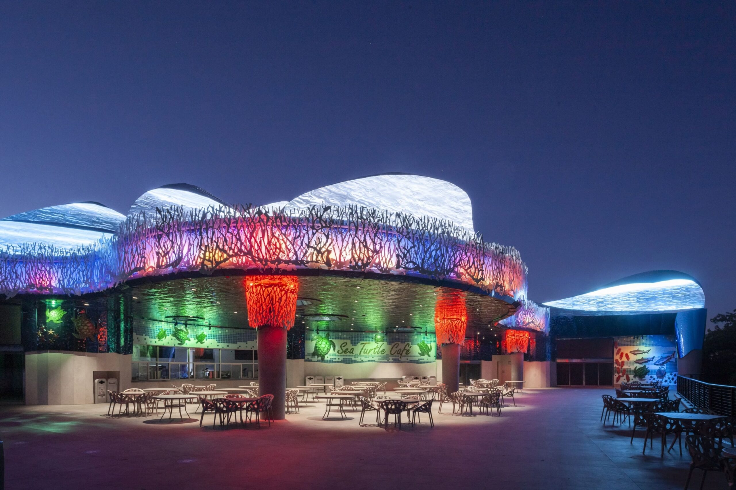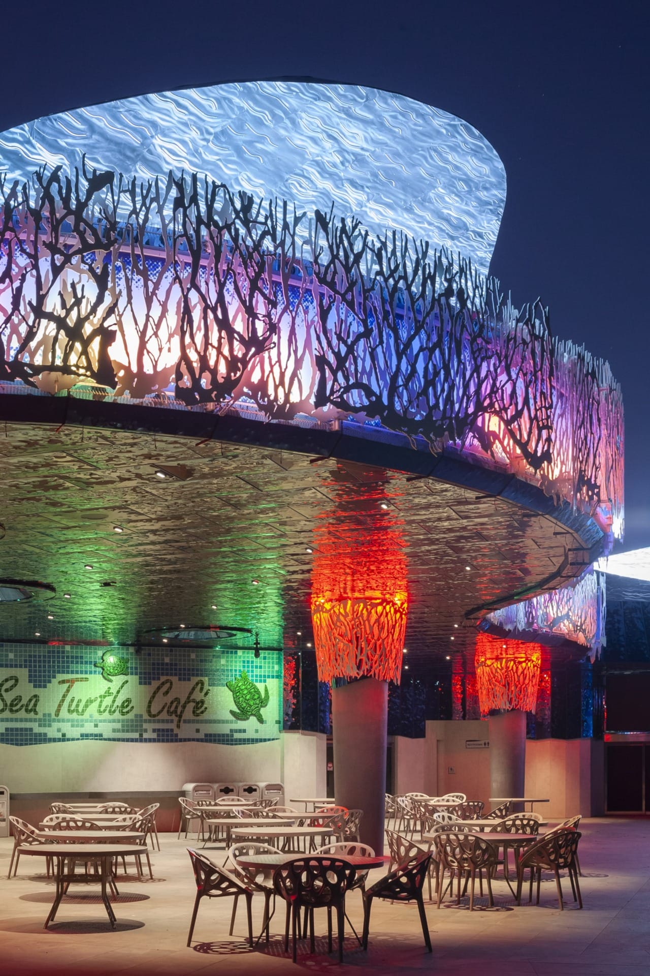 Decorative painted aluminum coral features adorn the edges of the café’s canopy and wrap the supporting columns. These were cut on our water jet before they were hand-rolled to the correct radius.