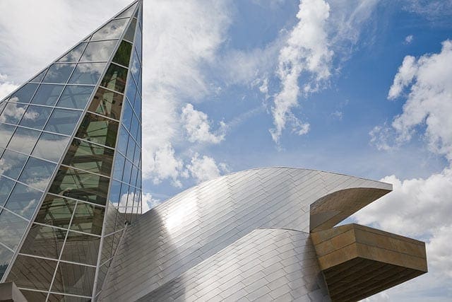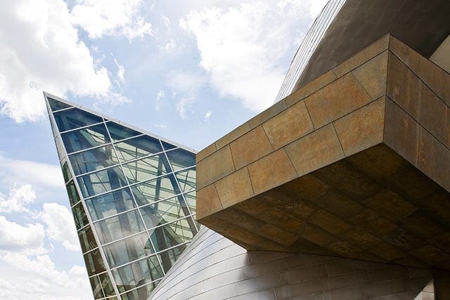 The building’s earth-toned exterior is a custom-patina product that Zahner refined for the Museum. Roano Zinc is a zinc plate surface with a custom patina. The preweathered surface provides a stable, matte surface, which stands the test of time against weathering. This preweathered zinc metalwork is used on both the exterior and interior surfaces. The surface of the lightly reflective metal is stainless steel with Angel Hair, a Zahner-patented mechanical finish on stainless steel.