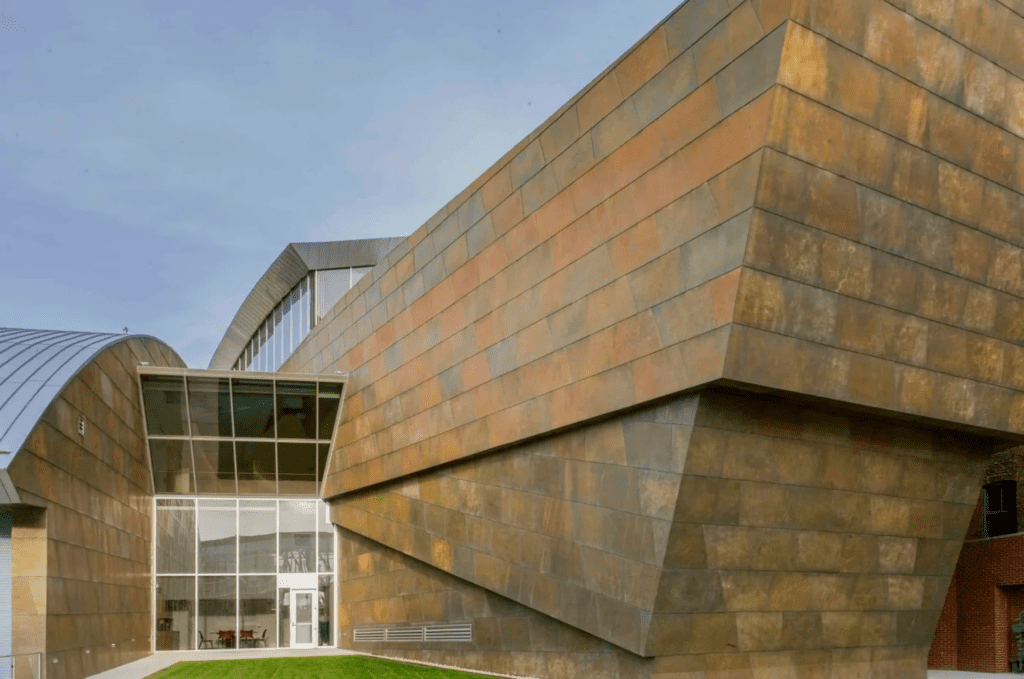 The building’s earth-toned exterior is a custom-patina product that Zahner refined for the Museum. Roano Zinc is a zinc plate surface with a custom patina. The preweathered surface provides a stable, matte surface, which stands the test of time against weathering. This preweathered zinc metalwork is used on both the exterior and interior surfaces. The surface of the lightly reflective metal is stainless steel with Angel Hair, a Zahner-patented mechanical finish on stainless steel.