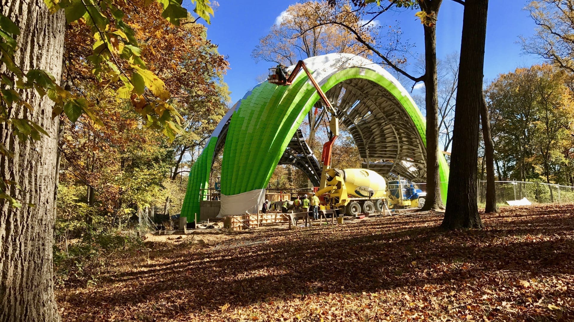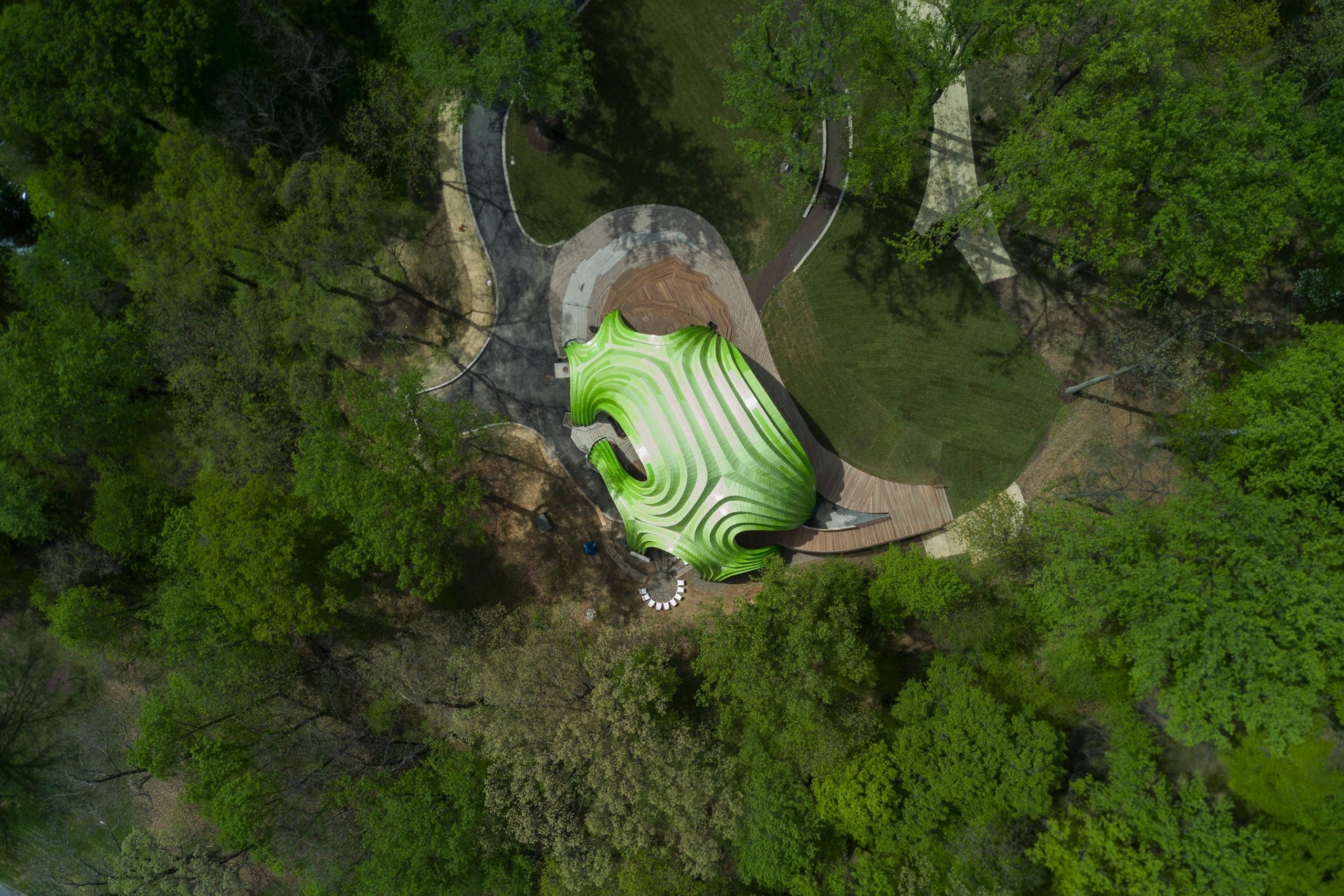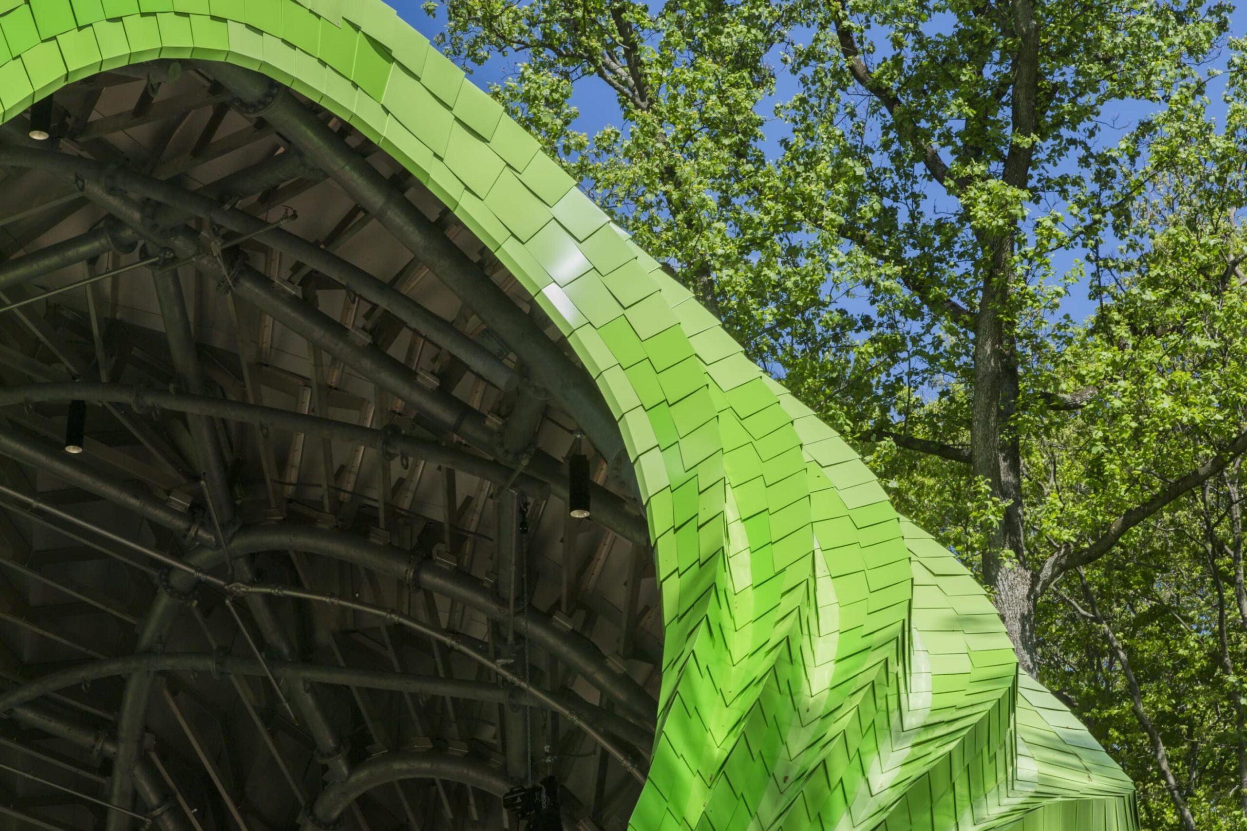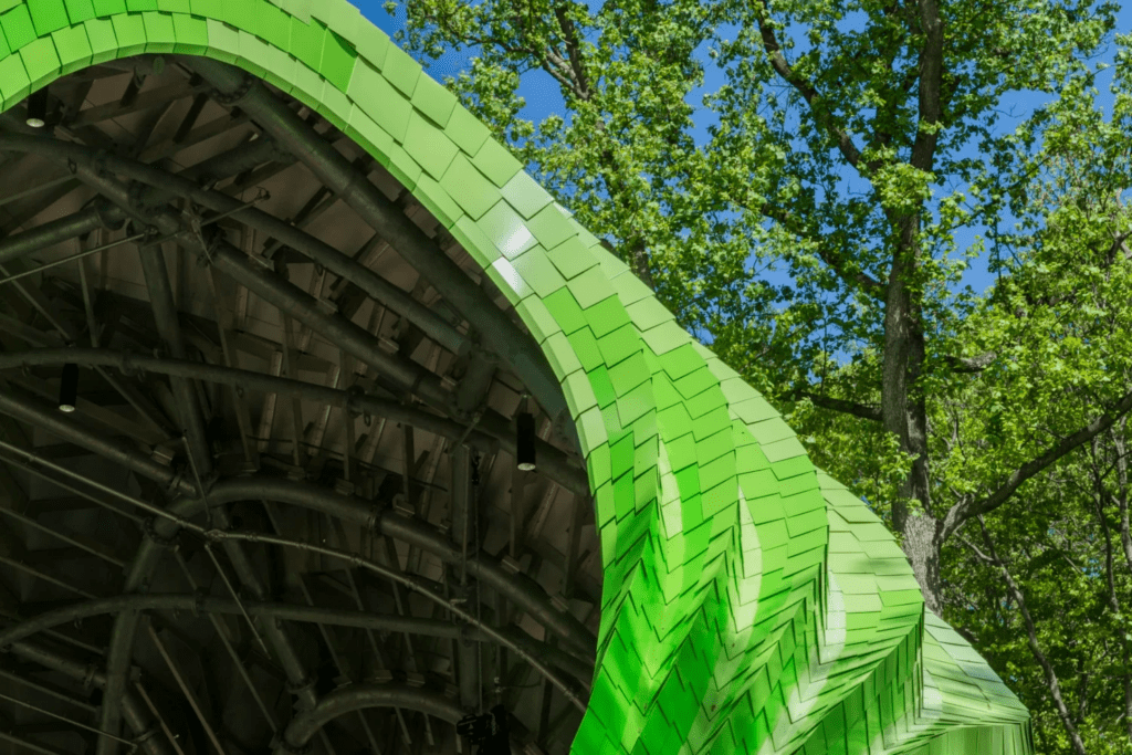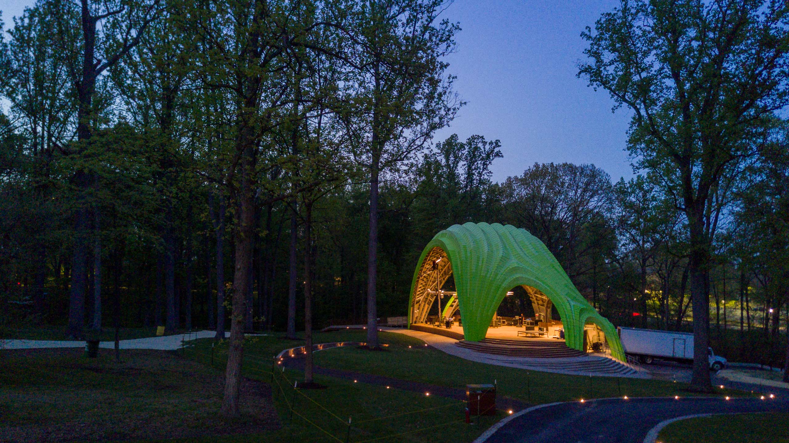Film of The Chrysalis at Merriweather Post Pavilion.Marc Fornes’ design for The Chrysalis was brought to life by a team which architects of record Living Design Lab and landscape designer Mahan Rykiel. included Whiting Turner, ARUP, Walters Group, and Zahner.