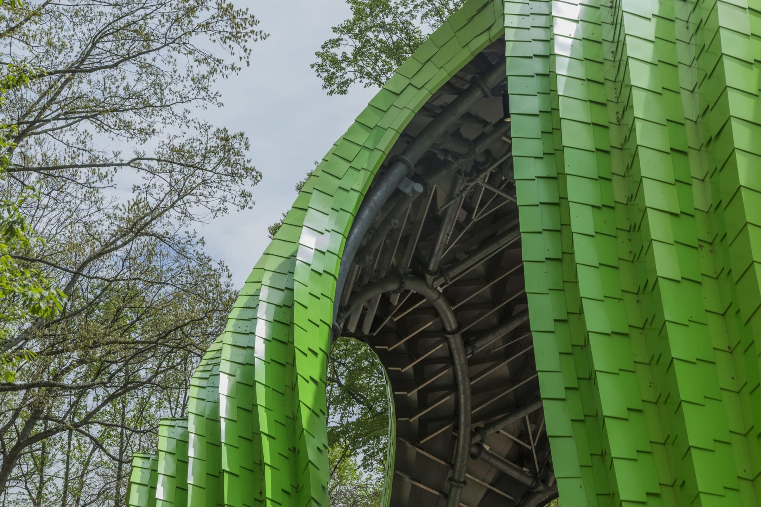 The Chrysalis is a multi-purpose pavilion, sculpture, and performance center designed by Marc Fornes with Living Design Lab. Zahner manufactured and installed the exterior structure and skin system.