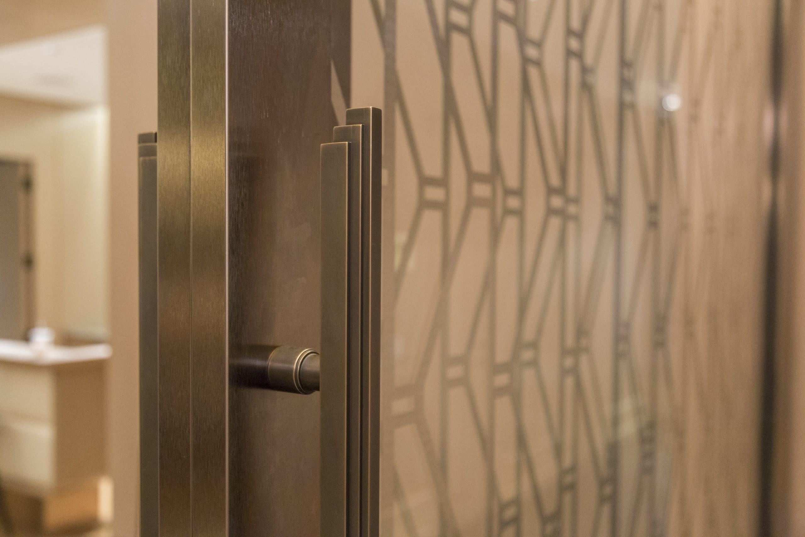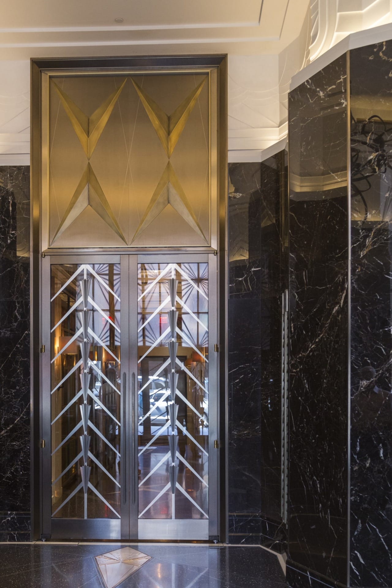As a historic building, it was important to maintain and reintroduce bronze and nickel silver features throughout the building. Zahner provided brass medallions, bronze leaf in glass, and nickel silver. These features included sliding glass door system for the interior lobby, elevator and door transoms, custom door and sidelites, and chevron mullion inserts for both the lobby, vestibule and exterior.