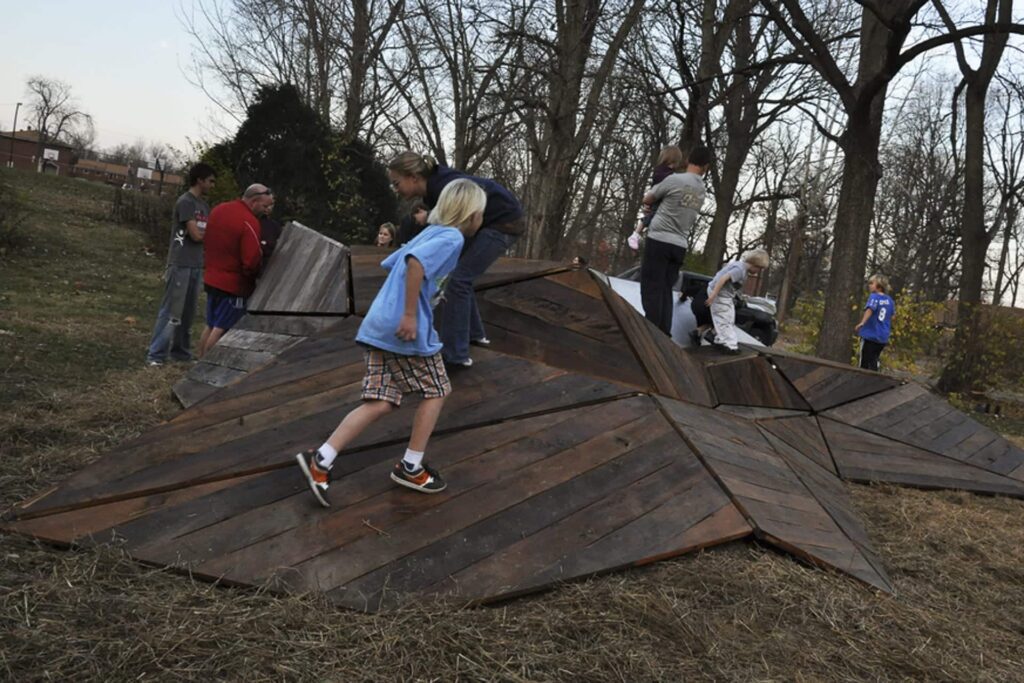 reBarn is a multi-use sculptural form designed by Project One with the students and faculty at Ball State. Permanently installed at Westside Park in Muncie, Indiana, the installation was made using reclaimed donated barn wood and Zahner-manufactured aluminum panels and hardware. The City of Muncie commissioned the artwork in partnership with Professor Kevin Klinger’s design studio at Ball State University and the Institute for Digital Fabrication.