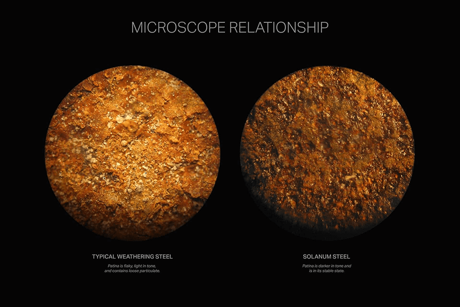Solanum Steel resolves this challenge by bringing the natural weathering steel alloy into an insoluble and stable state. This preweathered surface is accelerated in a dedicated Zahner facility for producing sheets and custom fabricated corten forms in Solanum Steel.