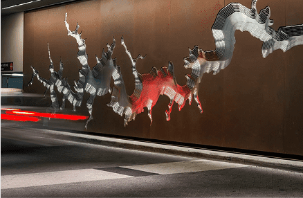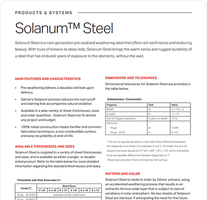 Solanum Steel is a pre-oxidized weathering steel (Corten) surface developed by Zahner. The surface is produced by accelerating the natural weathering process and stabilizing the result. Solanum Steel provides artists, architects, and designers with a range of resonant tones on an enduring surface.
