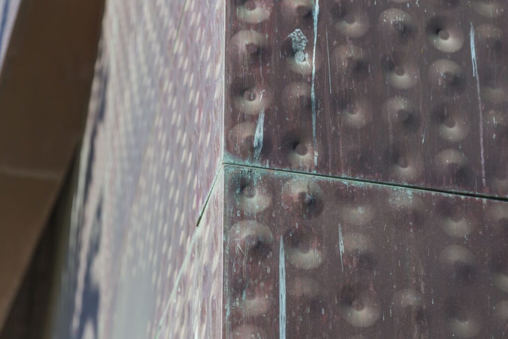 Architectural copper panels are typically installed as raw or ‘red’ copper sheets. The color progresses from reflective pinks and reds to a matte brown. However, it will take decades before the metal patinates into the blues and greens so desired for architectural projects.