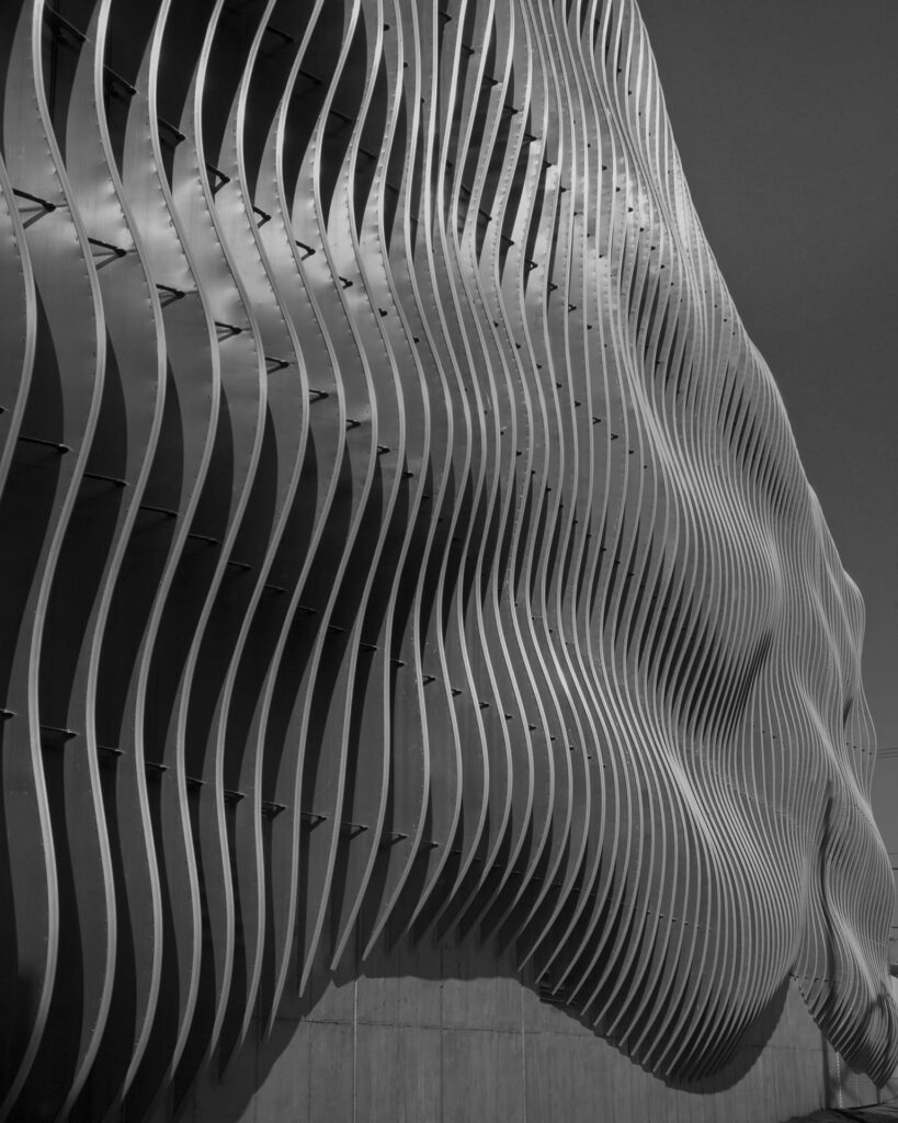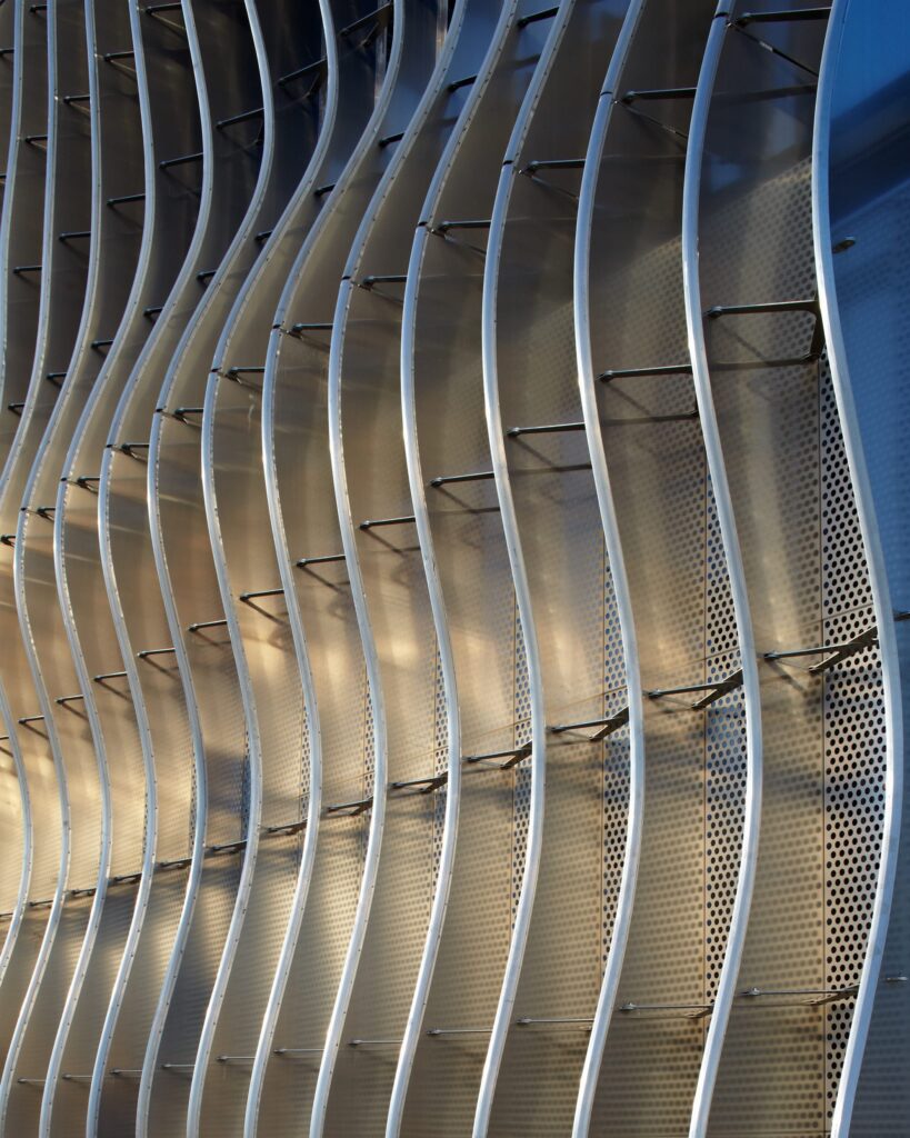 Undulating fin-facade of the Zahner “CloudWall” in Kansas City.