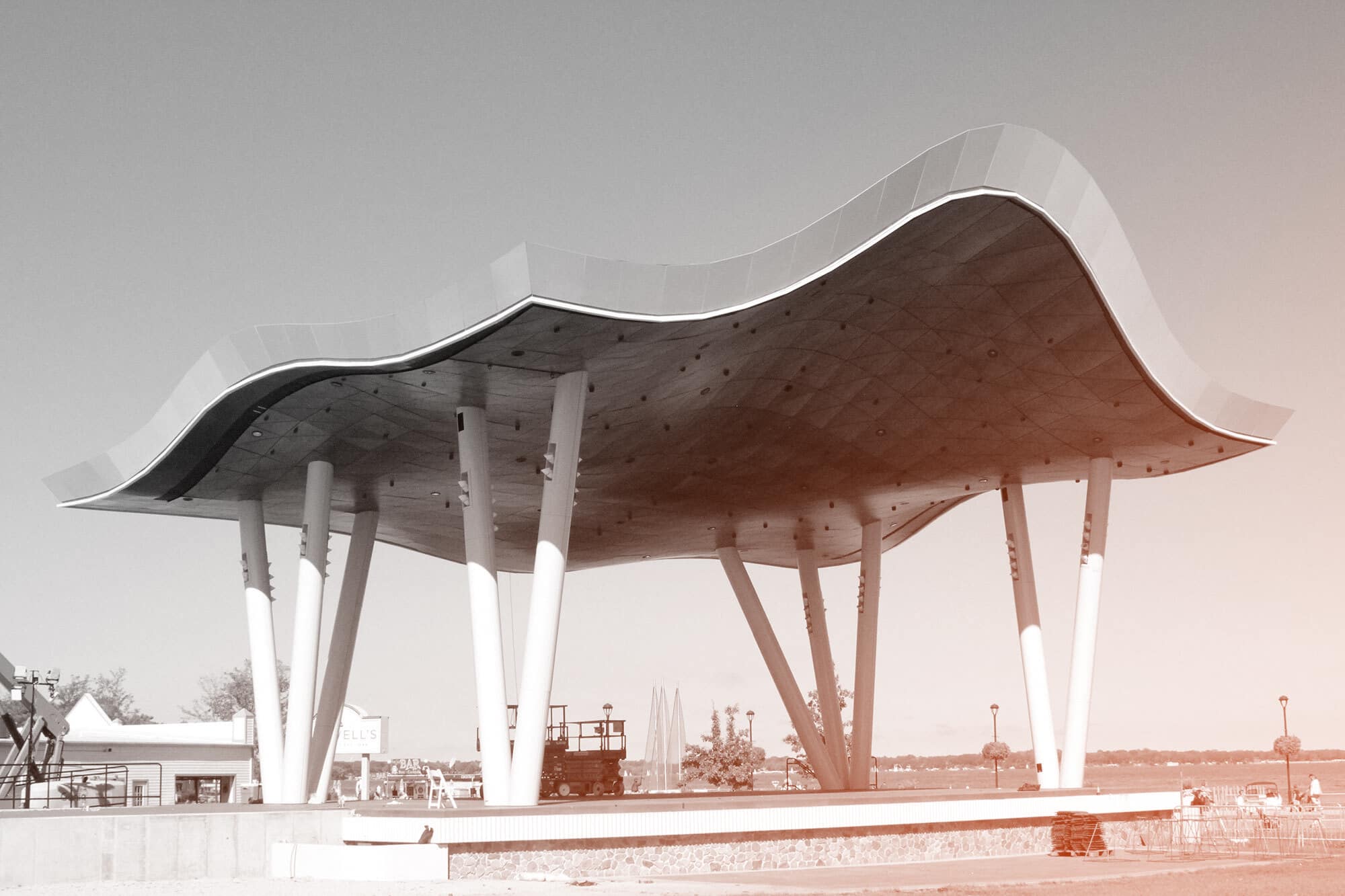 The Preservation Plaza Stage offers a one-of-a-kind concert setting with the backdrop of West Lake Okoboji’s blue waters glistening in the background. The desire by the Historic Arnolds Park Incorporation (HAPI) and RDG Planning & Design to transform the area into a permanent event space has been realized from what was previously a green space frequented by lake goers for events. Through a Zahner Assist engagement, Zahner worked with RDG to develop and refine the 6,400 square foot amphitheater that resembles the lake waves above and wooden boat hulls below. Nestled within the structural steel bays are Zahner’s patented aluminum ZEPPS. The structure finishes out with custom finished stainless steel flat seamroof panels, painted aluminum perimeter fascia, and columns covers.