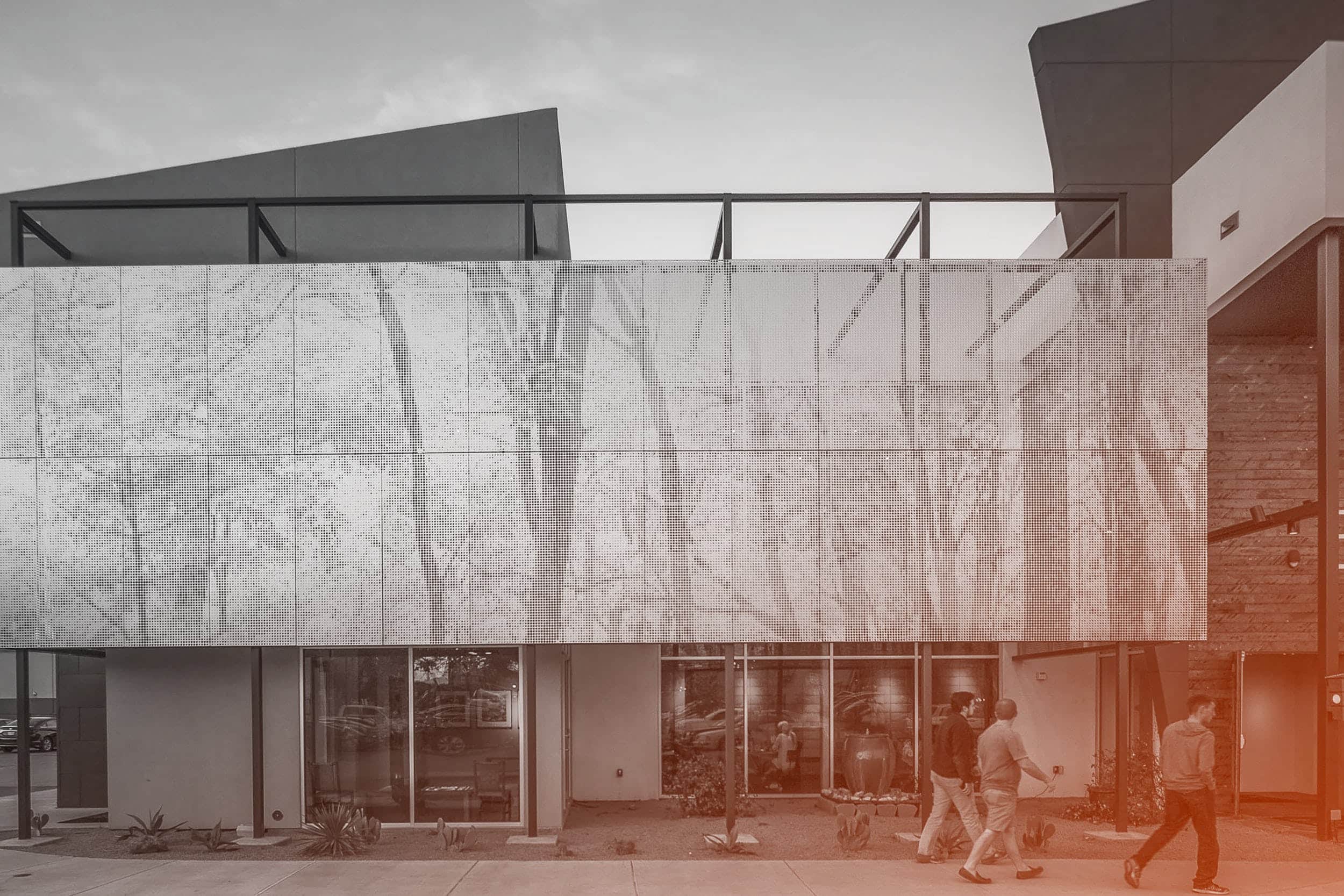 Restaurant facade and screen in angel hair stainless steel with imagery of tree branches. Fort Worth, TX Restaurant facade and screen in angel hair stainless steel with imagery of tree branches.