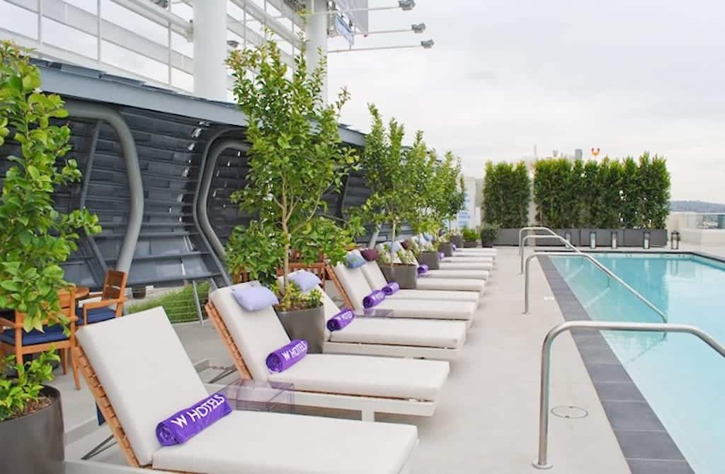 The highlight of the hotel’s rooftop pool area is a curving cabana wrapped in aluminum scales; it was designed by Daly Genik Architects, which also was responsible for the condominium interiors and the striking Douglas fir-lined lobby for the condo tower. Kevin Daly, a founder of the firm, said the W asked him to design the cabana as ‘a Venus’ flytrap for supermodels.