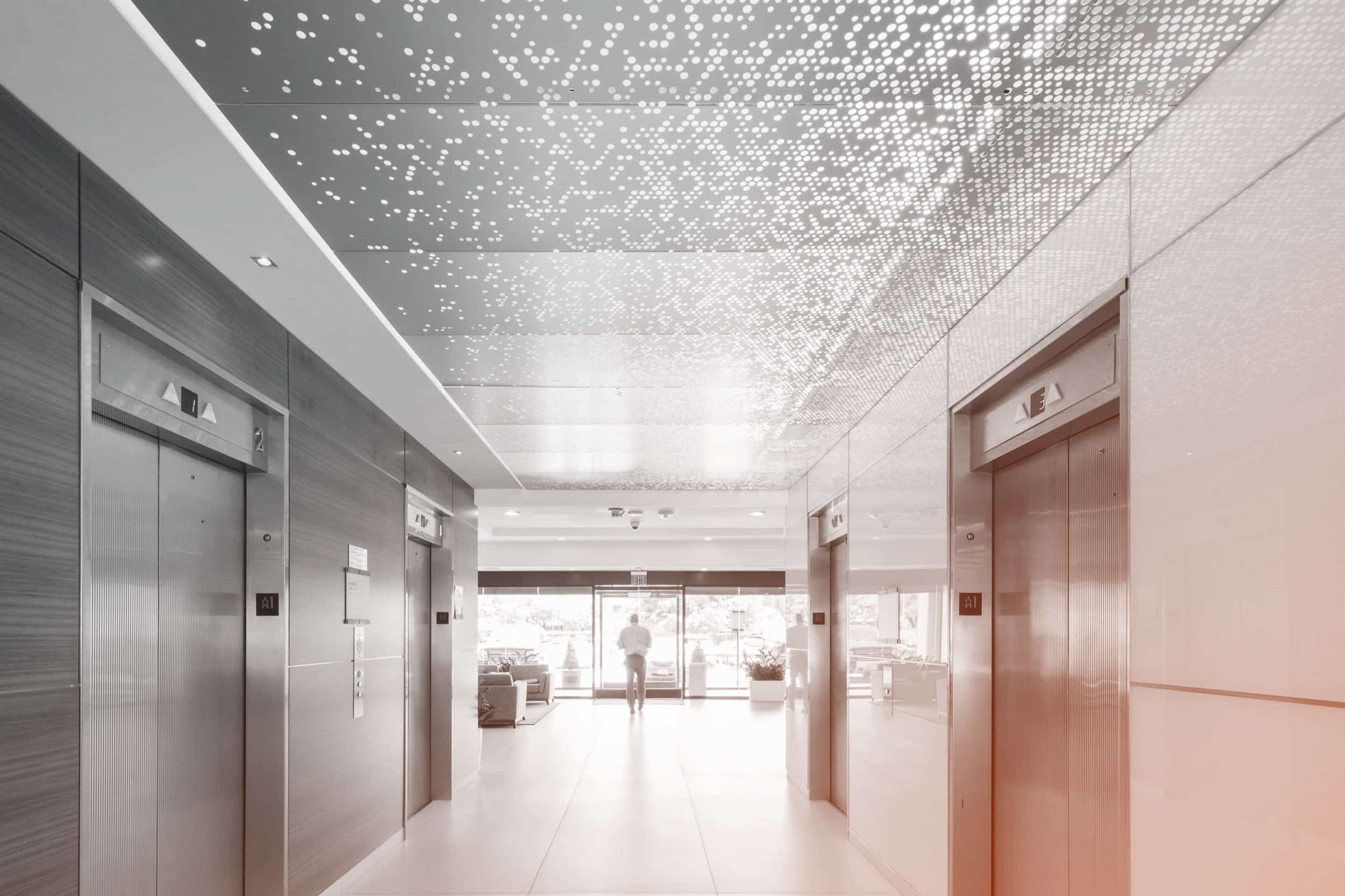 Abstract elevator lobby ceiling in clear anodized aluminum. Dallas, Texas Abstract elevator lobby ceiling in clear anodized aluminum.