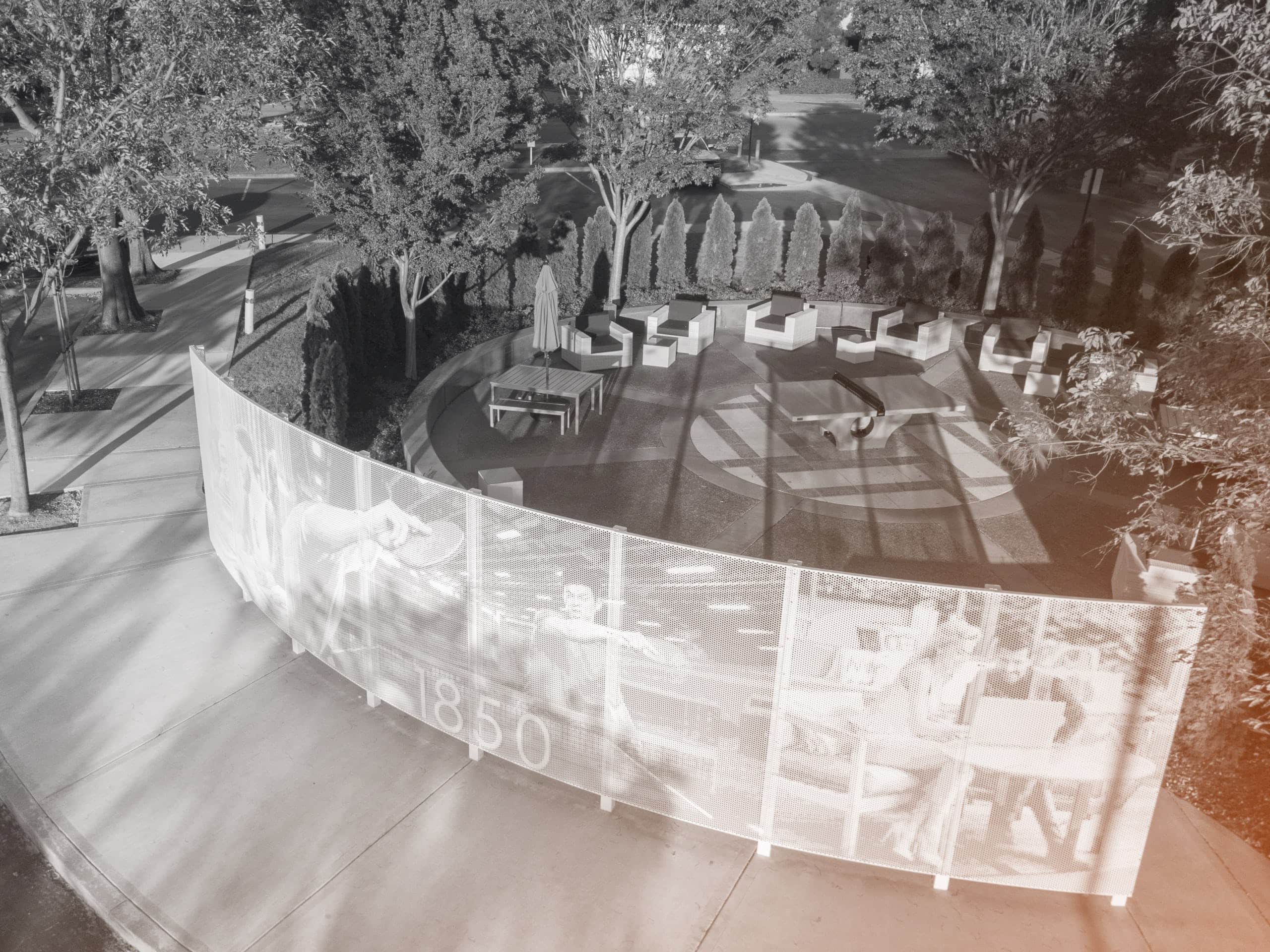 Curved free-standing screen in painted aluminum for an office building courtyard. San Mateo, CA Curved free-standing screen in painted aluminum for an office building courtyard.