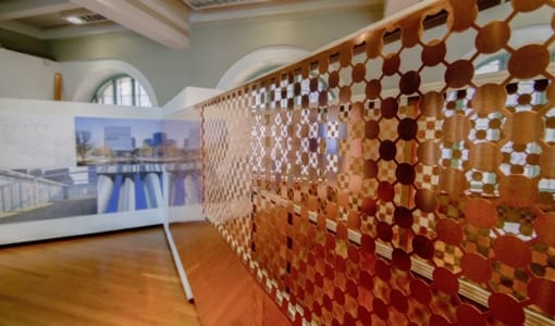 The completed project features the artist’s pattern on both the interior and exterior of the student center. Note how the lines transition smoothly across seams from plate to plate. Zahner engineers worked to transfer the artist’s drawings into metal, all while maintaining the system’s parametric relationship.