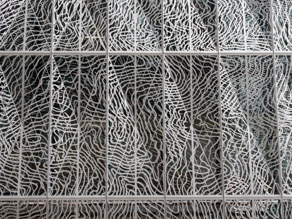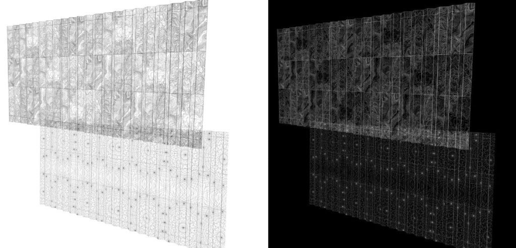 The facade was constructed in two layers. The designs were inspired by topographical maps provided to the artist by The Mexican Land Survey.